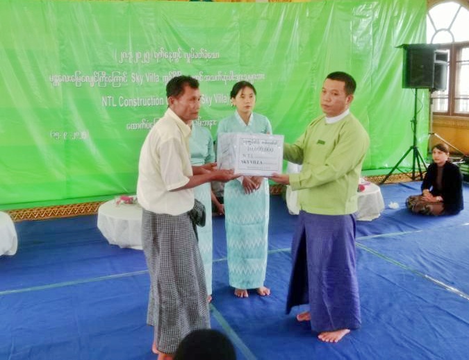 မန္တလေးမြေငလျင်ကြီးကြောင့် Sky Villa Condo ပြိုကျမှုတွင် အသက်ဆုံးရှုံးခဲ့ရသော မိသားစုများအား ဂရုဏာကြေး ဒုတိအသုတ်ပေးအပ်ပွဲအခမ်းအနားကို စက်တင်ဘာ ၁၅ ရက်မွန်းလွဲ ၂ နာရီက အောင်မြေသာစံမြို့နယ်၊ ဒေါနဘွားရပ်ကွက်၊ အကွက်(၄၅)၊ ၁၉ လမ်း၊ ၅၉ လမ်းထောင့်ရှိ မုန်တိုင်ဓမ္မာရုံ၌ ကျင်းပရာ ခရိုင်အထွေထွေအုပ်ချုပ်ရေးဦးစီးဌာနမှ လက်ထောက်ညွှန်ကြားရေးမှူး ဦးဝင်းနိုင်ထွန်း၊ ခရိုင်ရဲ တပ်ဖွဲ့မှူးရုံးမှ ဒုရဲမှူးမျိုးဝင့်၊ NTL ဆောက်လုပ်ရေးကုမ္ပဏီမှ MD ဦးနိုင်ထွန်းလင်း၏ဇနီး ဒေါ်သက်သက်ခိုင်၊ Sky Villa Condo minium & Condo တာဝန်ခံမန်နေဂျာ ဦးလင်းလင်းထွန်းနှင့် တာဝန်ရှိသူများ၊ အသက်ဆုံးပါးသွားသူများ၏ မိသားစုဝင်များတက်ရောက်ကြသည်။