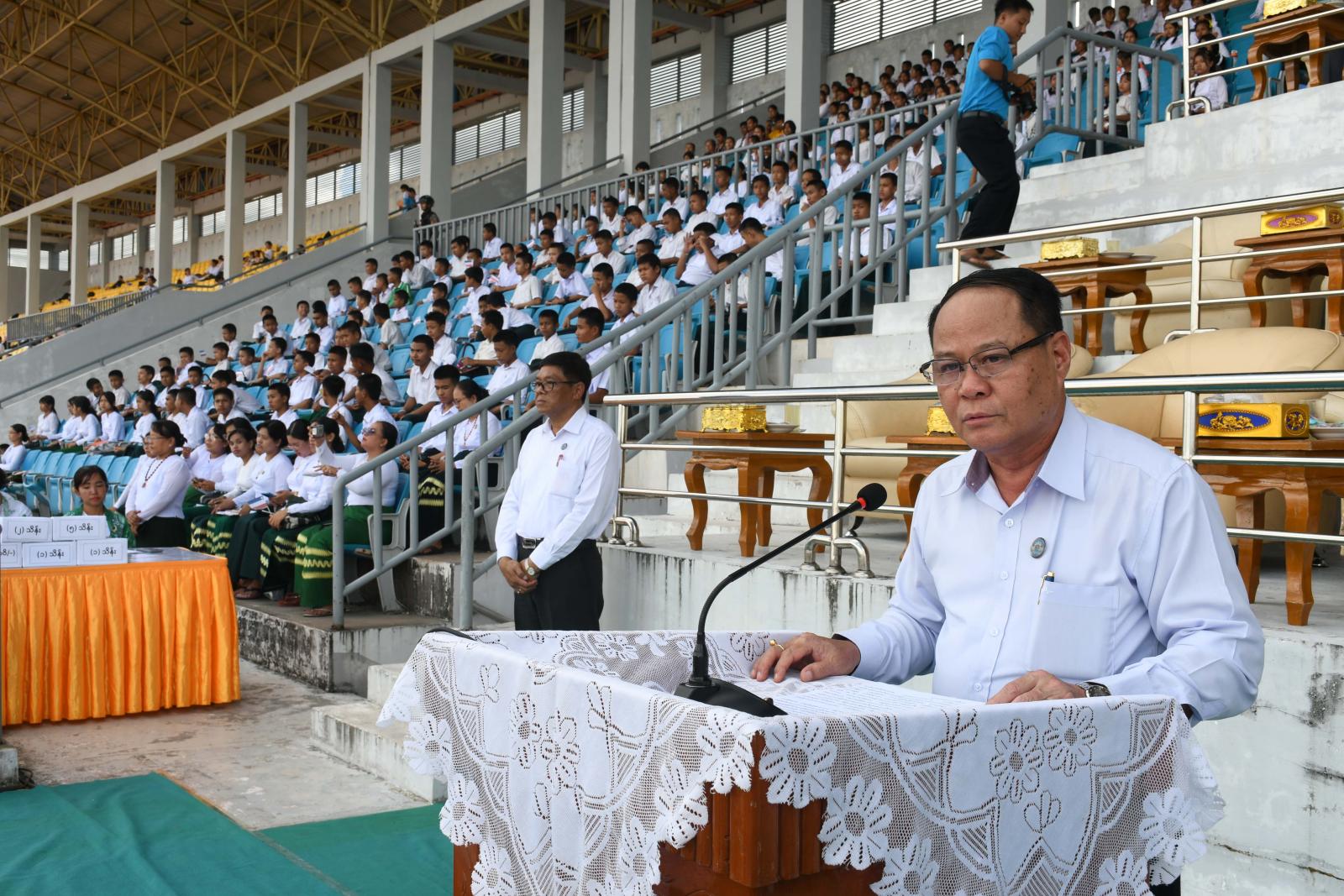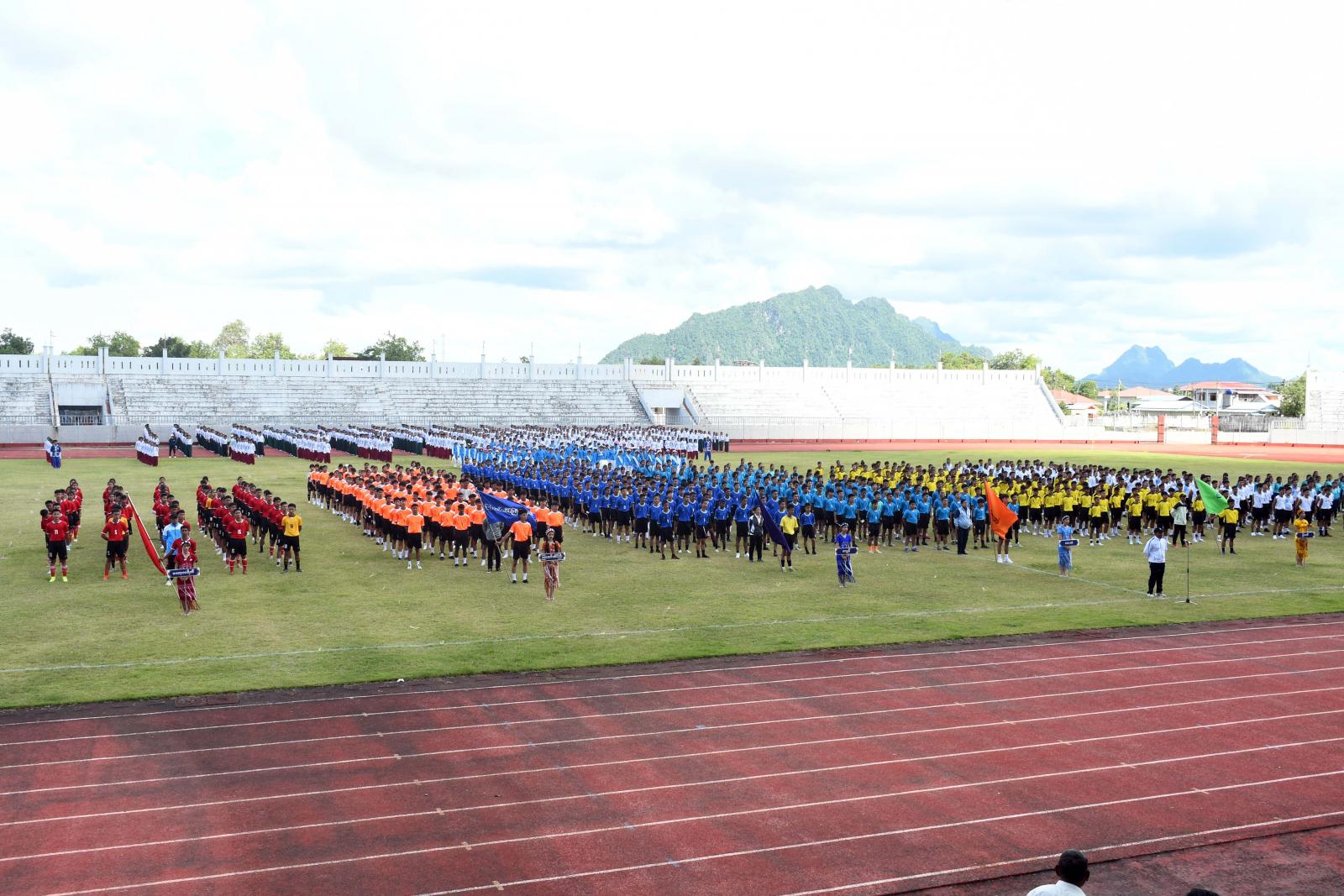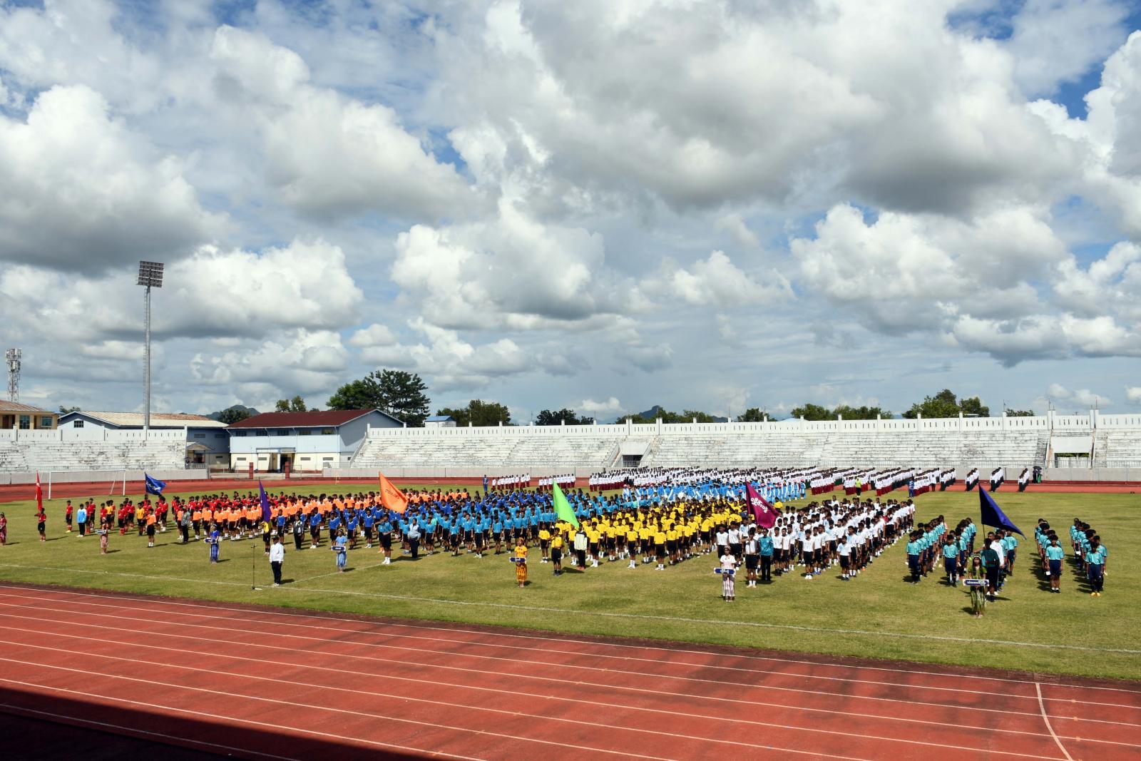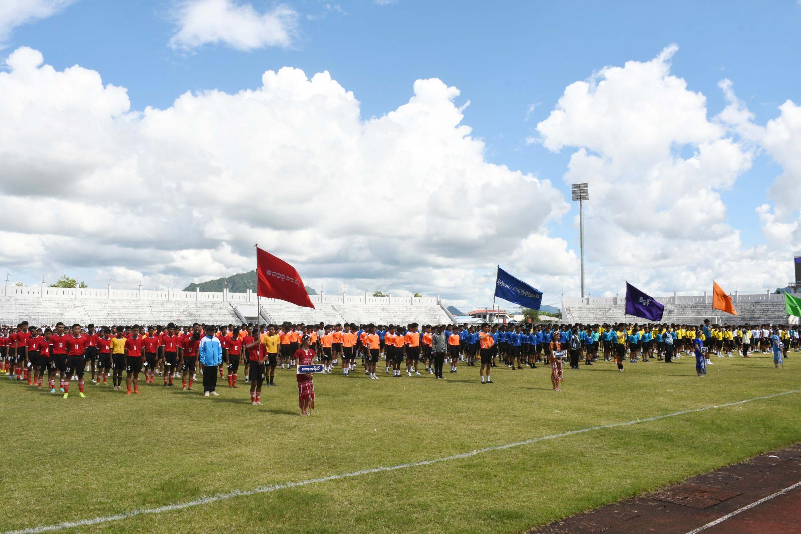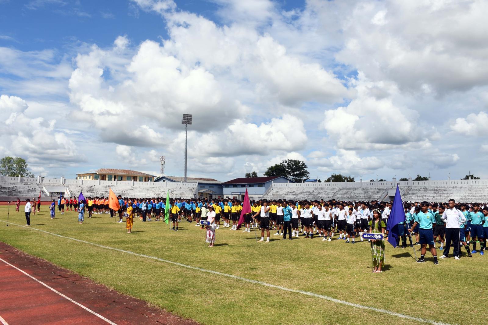 ဦးစွာ မြို့နယ်အသီးသီးမှ အားကစားသမားများသည် စစ်ကြောင်းပုံစံဖြင့် နိုင်ငံတော်အလံငယ်နှင့် ပြည်နယ်အလံငယ်များဝှေ့ရမ်းပြီး တက်ရောက်လာသော ပြည်နယ်ဝန်ကြီးချုပ်၊ ပြည်နယ်တရားလွှတ်တော်တရားသူကြီးချုပ်၊ ပြည်နယ်အစိုးရအဖွဲ့ဝင်များ၊ ကျောင်းသား၊ ကျောင်းသူ၊ ဆရာ၊ ဆရာမများ၊ အားကစားဝါသနာရှင်များအား နှုတ်ဆက်၍ ကွင်းအတွင်း နေရာယူကြပြီး ပြည်နယ် ဝန်ကြီးချုပ်ဦးစောမြင့်ဦးက ကာယ၊ ဉာဏ၊ စာရိတ္ထ၊ ရသ၊ သက်မွေး၊ ဘက်စုံပညာရေးဆိုသည့် ဆောင်ပုဒ်နှင့်အညီ ကျောင်းသား၊ ကျောင်းသူများ ကျန်းမာကြံ့ခိုင်၍ ပညာထူးချွန် လူရည်မွန်များဖြစ်အောင် စာသင်ကျောင်းများက လေ့ကျင့်ပျိုးထောင်ကြရန်နှင့် အခြေခံပညာကျောင်းများမှနေ၍ ပေါ်ထွက်လာသည့် အားကစားမောင်မယ်များဖြင့် နိုင်ငံ့ဂုဏ်ကိုမြှင့်တင်နိုင်သည်အထိ ရည်မှန်းချက်များထားကာ ဘက်စုံထူးချွန်သည့်နိုင်ငံ့ ကိုယ်စားပြုလက်ရွေးစင်များဖြစ်အောင် ကြိုးစားကြစေလိုကြောင်း ပြောကြား၍ ပြိုင်ပွဲအားဖွင့်လှစ်ပေးသည်။