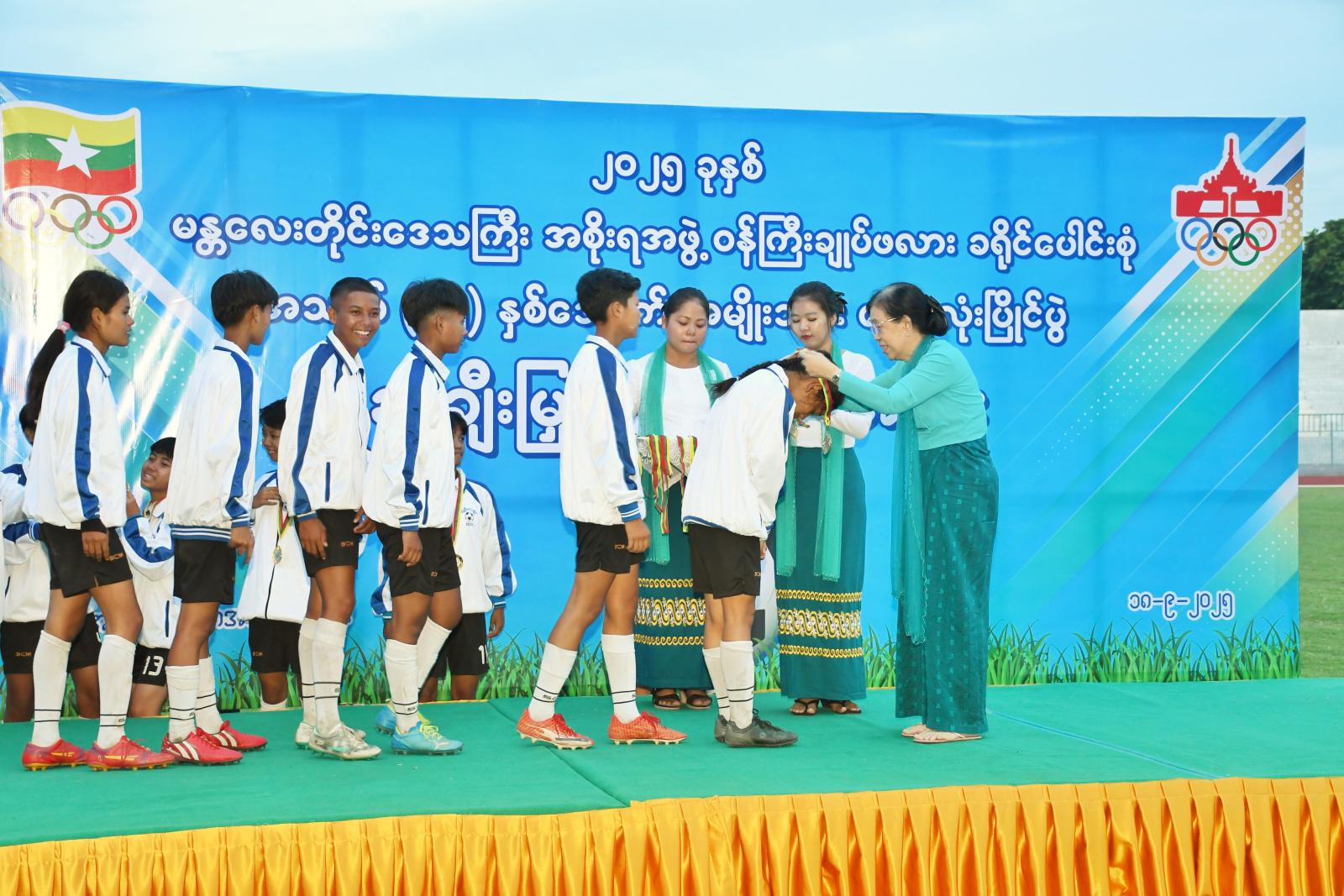 ဆက်လက်၍ ဆုချီးမြှင့်ပွဲအခမ်းအနားကိုကျင်းပရာ တိုင်းဒေသကြီးဘောလုံးဆပ်ကော်မတီ ဥက္ကဋ္ဌ ဦးစောငြိမ်း၊ တိုင်းဒေသကြီး အမျိုးသမီးအားကစားဆပ်ကော်မတီ ဥက္ကဋ္ဌနှင့် ကော်မတီဝင်များက နေရာအလိုက် အကောင်းဆုံးဆုရရှိသည် အားကစားသမားများကို ဆုများ ချီးမြှင့်ခဲ့သည်။