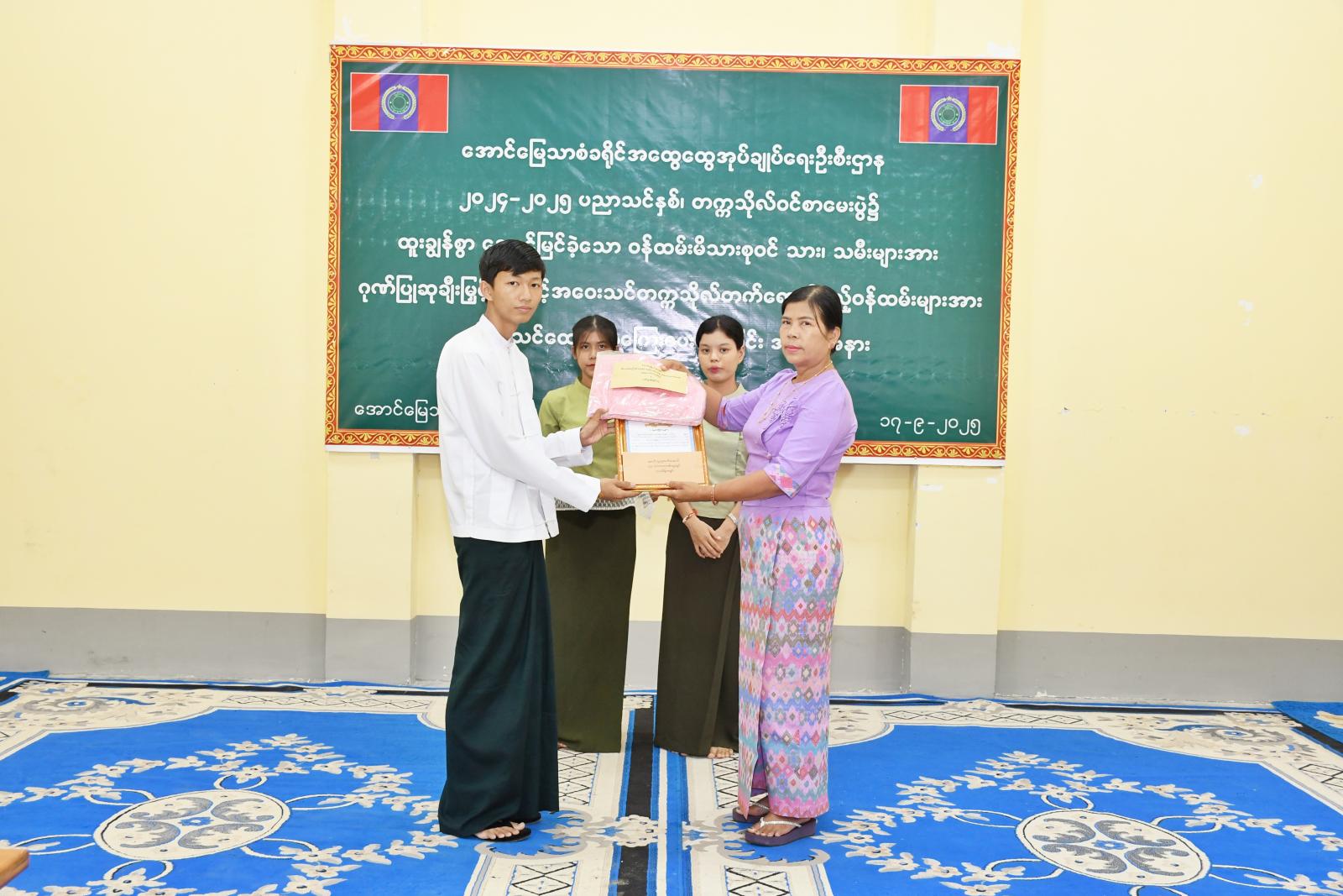 မန္တလေးတိုင်းဒေသကြီး အောင်မြေသာစံခရိုင် အထွေထွေအုပ်ချုပ်ရေးဦးစီးဌာနက တက္ကသိုလ်ဝင် စာမေးပွဲ၌ ထူးချွန်စွာအောင်မြင်ခဲ့သော ဝန်ထမ်းမိသားစုဝင်သားသမီးများ ဂုဏ်ပြုဆုချီးမြှင့်ပွဲနှင့် အဝေးသင်တက်ရောက်မည့် ဝန်ထမ်းများအား ပညာသင်ချီးမြှင့်ငွေပေးအပ်ပွဲ အခမ်းအနားကို စက်တင်ဘာ ၁၇ ရက်က အောင်မြေသာစံမြို့နယ် မန်းတောင်ခြေရှိ အဆိုပါရုံးတွင်ကျင်းပသည်။