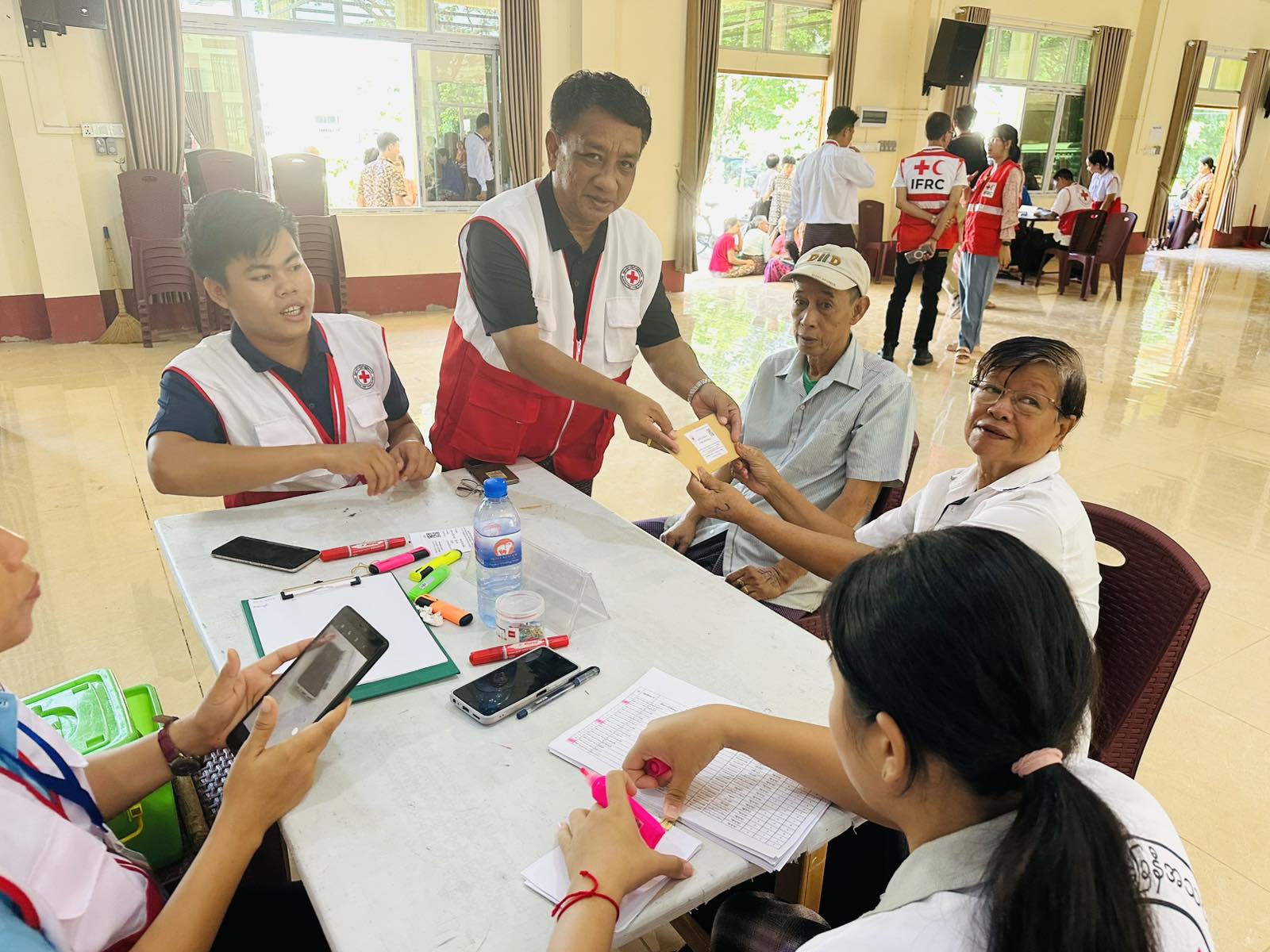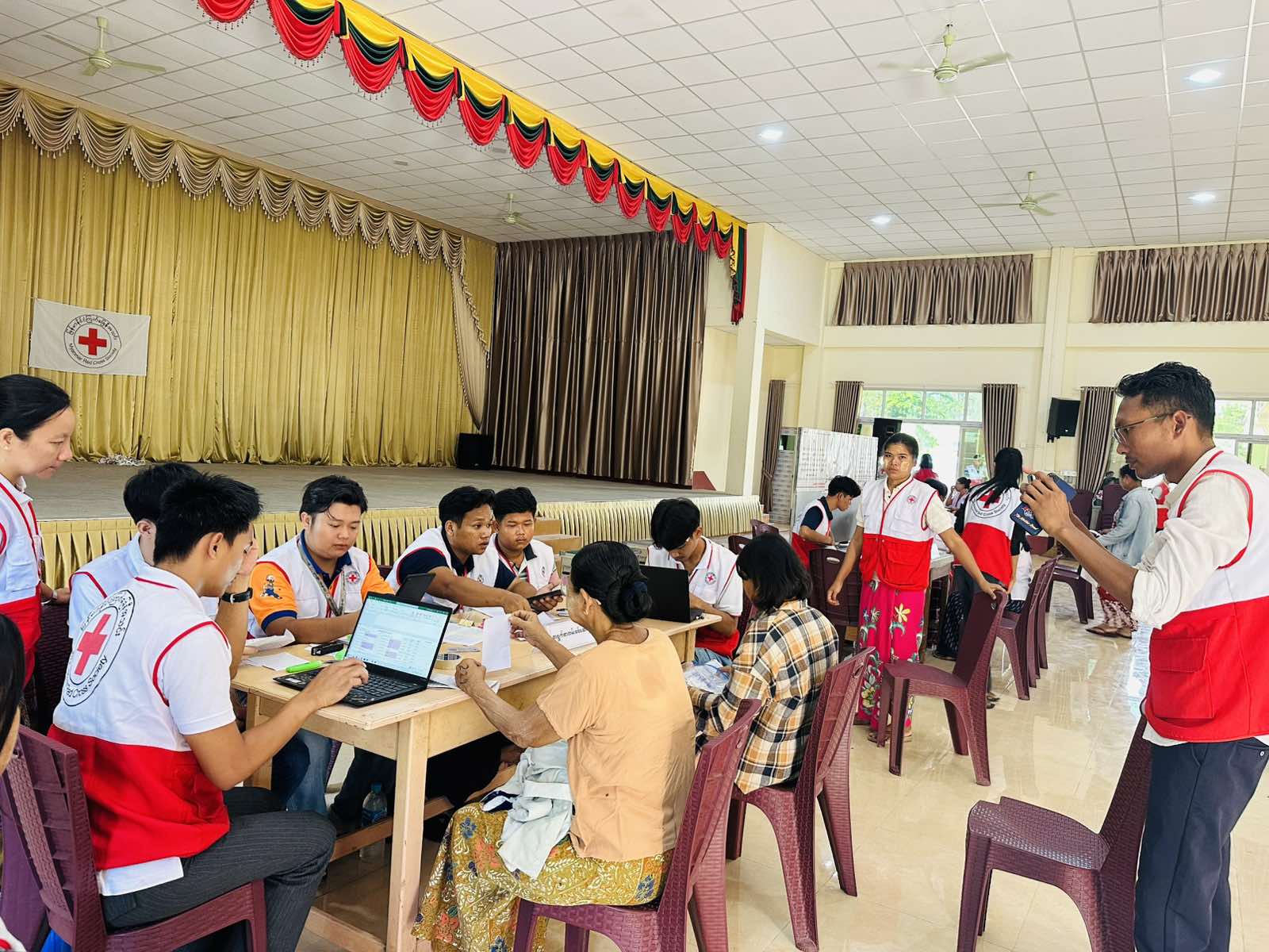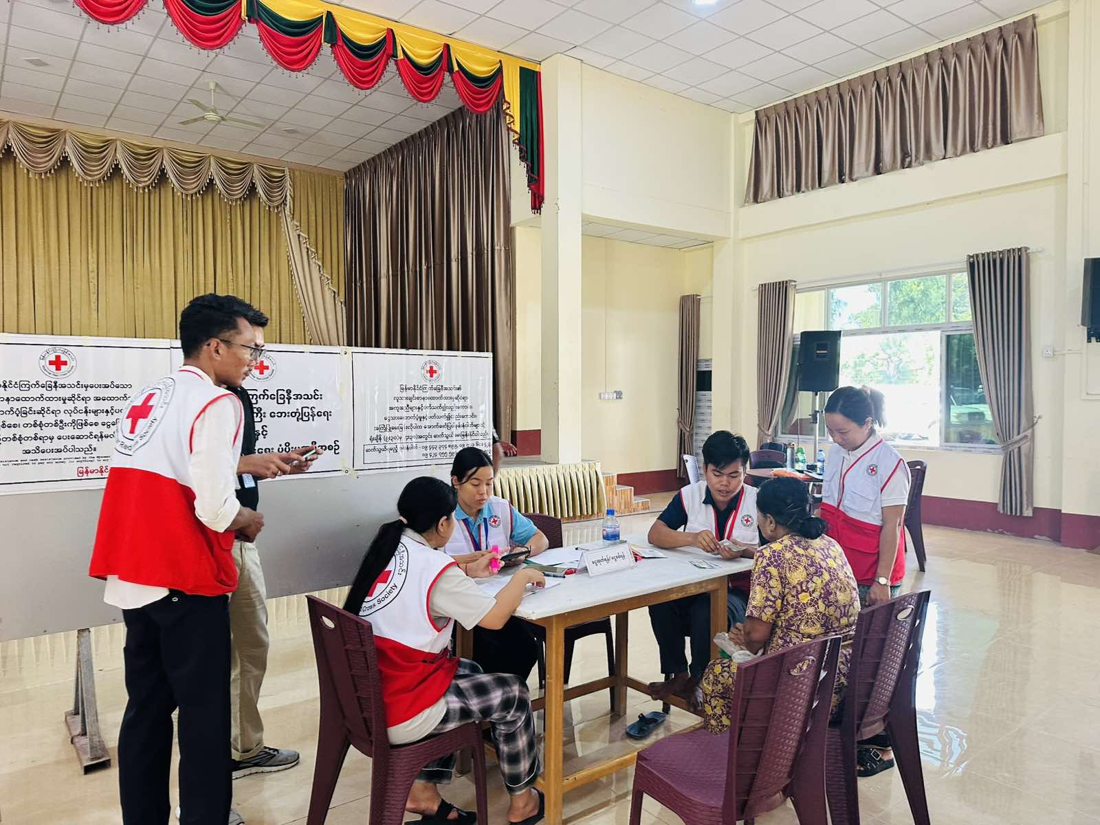 မြန်မာနိုင်ငံကြက်ခြေနီအသင်းအနေဖြင့် လူသားချင်းစာနာ ထောက်ထားမှုဆိုင်ရာအကူအညီများ ဆောင်ရွက်ပေးလျက်ရှိရာ ငလျင်ဘေးသင့်အကျိုး ခံစားခွင့်ရှိသူများအား မြန်မာနိုင်ငံကြက်ခြေနီအသင်း ဘေးအန္တရာယ်စီမံခန့်ခွဲမှုဆိုင်ရာဌာနမှ လက်ထောက် ငွေသားနှင့် ပြေစာထောက်ပံ့ရေးအရာရှိ ဦးချမ်းမြေ့ ထွန်းနှင့်တပ်ဖွဲ့ဝင်(၂၅)ဦးတို့က မြစ်သားမြို့ပေါ်(၆)ရပ် ကွက်ရှိငလျင်ဘေးသင့် အိမ်ထောင်စု (၄၄၀) စုအား ငွေသားပေးအပ်ခဲ့ပြီး အိမ်ထောင်စု (၁) စုလျှင်ကျပ် ၄၀၀၀၀ဝိ/-ကျပ်နှုန်းပေးအပ်ခဲ့သည်။ ဆက်လက်၍ ငွေပေးအပ်ရာနေရာသို့ မြို့နယ်ကြက်ခြေနီအသင်းဖွဲ့ဥက္ကဋ္ဌ ဦးတင့်လွင်ဦးနှင့် ကြက်ခြေနီအသင်းဖွဲ့ဝင်များ၊ ရပ်ကွက်အုပ်ချုပ်ရေးမှူးများနှင့် ရာအိမ်မှူးများက အနီးကပ်ကြီးကြပ်ပေးလျက်ရှိကြောင်း သိရသည်။