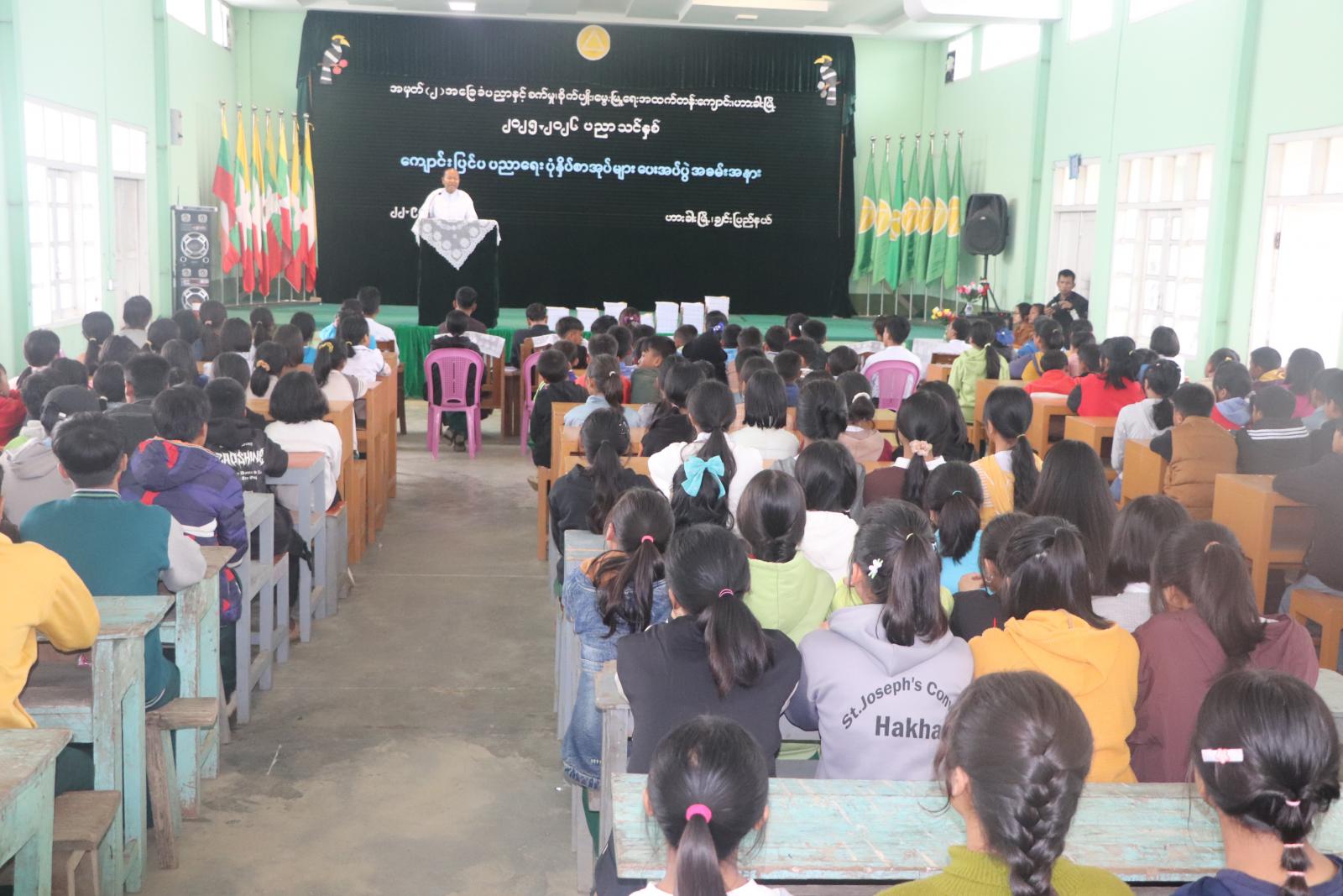 အခမ်းအနားတွင် ချင်းပြည်နယ်အစိုးရအဖွဲ့ ခေတ္တလူမှုရေးရာဝန်ကြီး ဦးစိန်ထွန်းလှနှင့် သယံဇာတရေးရာဝန်ကြီး ဦးကောလ်လျန်ထန်းတို့က အမှာစကားပြောကြားကြပြီး ကျောင်းပြင်ပနှင့် တစ်သက်တာပညာရေးကျောင်းတွင် ပညာသင်ကြားနေသော မူလတန်းအဆင့် level-1 အတွက် ပုံနှိပ်စာအုပ် ( ၄၄ ) စုံကို ခေတ္တလူမှုရေးရာဝန်ကြီးကလည်းကောင်း၊ မူလတန်းအဆင့် level-2 အတွက် ပုံနှိပ်စာအုပ် ( ၆၅ ) စုံကို သယံဇာတရေးရာဝန်ကြီးကလည်းကောင်း ပေးအပ်ကြပြီး ဟားခါးမြို့နယ် ပညာကော်မတီ တာဝန်ရှိသူများက လက်ခံရယူကြသည်။