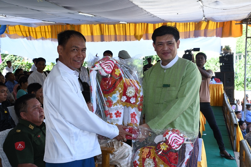 ဆက်လက်၍ ပြိုင်ပွဲဝင်ဆင်များမှ “အောင်စေပိုင်စေ” သီချင်းဖြင့် ဧည့်ခံဖျော်ဖြေခဲ့ပြီး ကျောက်ဆည်ခရိုင် စီမံခန့်ခွဲရေးနှင့်အုပ်ချုပ်ရေးကော်မတီဥက္ကဌက ဧည့်သည်တော်များအား ဆင်အကအလှပြိုင်ပွဲအမှတ်တရ လက်ဆောင်များပေးအပ်ခဲ့ကြသည်။