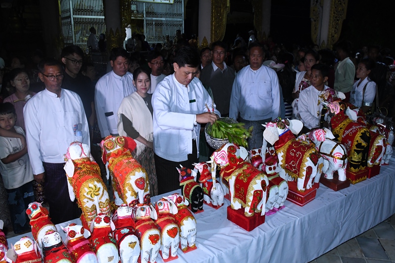 ရှေးဦးစွာ ရွှေသာလျောင်း၊ လေးမျက်နှာ၊ ရွှေမုဌောဘုရားများ၏ ဦးစီးနာယကပဓာန ဩဝါဒစရိယဆရာတော် ဘဒ္ဒန္တဦးစက္ကိန္ဒာဘီဓဇအမှူးပြုသော ပင့်သံဃာဆရာတော် (၁၁)ပါးအား ကျောက်ဆည်ခရိုင်စီမံခန့်ခွဲရေးနှင့်အုပ်ချုပ်ရေးကော်မတီဥက္ကဋ္ဌ ဦးဇော်ဟိန်းအောင်နှင့် မြို့မိမြို့ဖများ၊ မြို့နယ်စီမံခန့်ခွဲရေးနှင့်အုပ်ချုပ်ရေးကော်မတီဥက္ကဋ္ဌ ဦးထိုက်ထိုက်ဇော်နှင့် အဖွဲ့ဝင်များ၊ ပြည်သူများက အရုဏ်ဆွမ်းများ ဆက်ကပ်လှူဒါန်းခဲ့ပြီး လှူဒါန်းမည့် ဆင်များအား ရွှေရည်ငွေရည်ပက်ဖျန်းကာ ရွှေသာလျောင်းဆုတောင်းပြည့်စေတီတော်မြတ်ကြီးအား လက်ယာရစ်သုံးပတ်လှည့်လည်၍ လှူဒါန်းခဲ့ကြောင်း သိရှိရသည်။