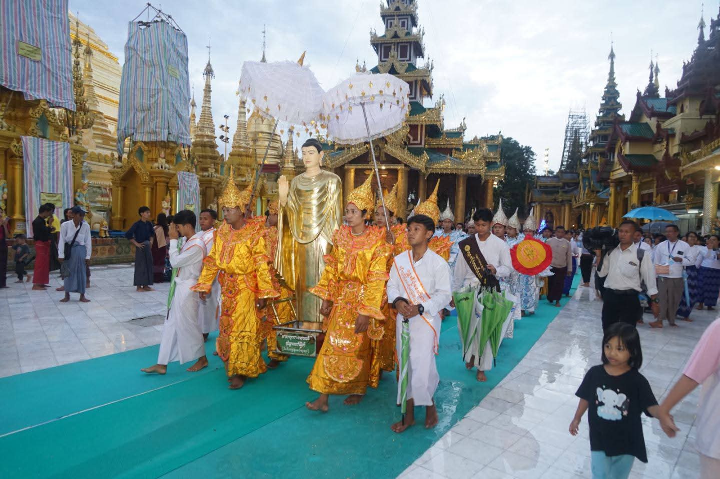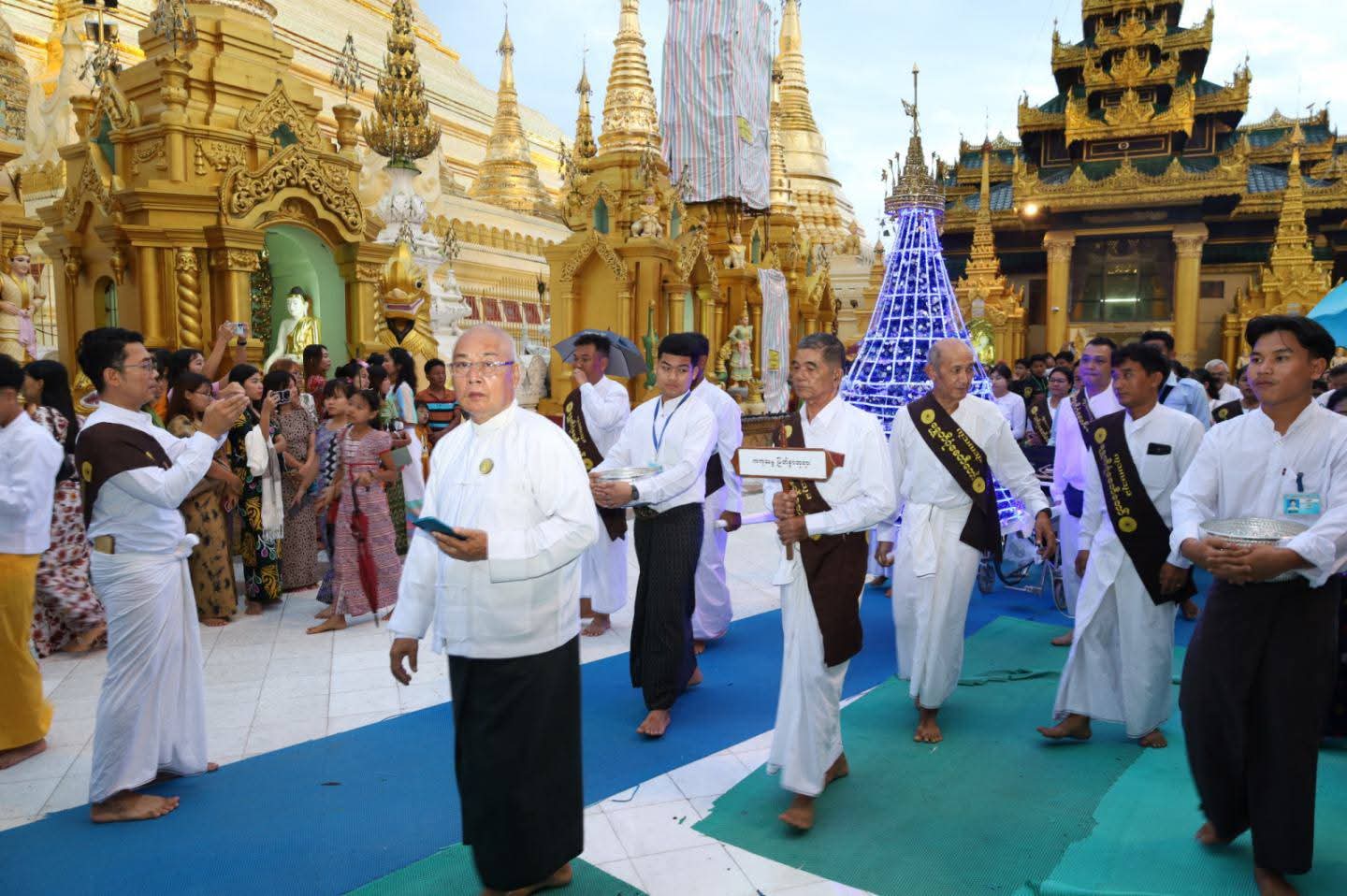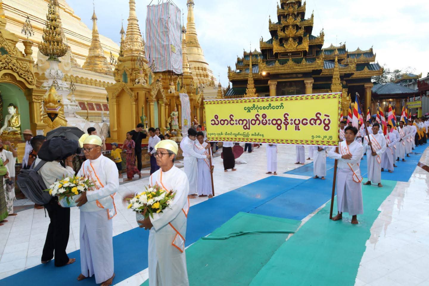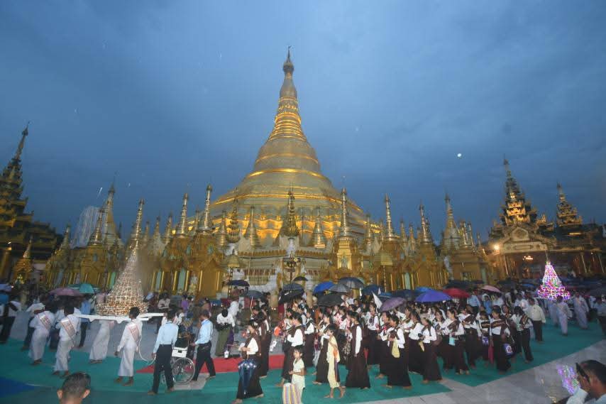 ဦးစွာ ရန်ကုန်တိုင်းဒေသကြီးဝန်ကြီးချုပ် ဦးစိုးသိန်း၊ တိုင်းဒေသကြီးဝန်ကြီးများ၊ ဘဏ္ဍာတော်ထိန်း ဂေါပကအဖွဲ့ဝင်များနှင့် ဂေါပကရုံးဝန်ထမ်းများ၊ ဘာသာရေးဝတ်အသင်းအဖွဲ့များ၊ အလှူရှင်များနှင့် ဘုရားဖူးလာပြည်သူများက ရှေးဟောင်းဗုဒ္ဓရုပ်ပွားတော်များတန်ဆောင်းစုရပ်မှ ဗုဒ္ဓရုပ်ပွားတော်နှင့် လျှပ်စစ်မီးစေတီများပင့်ဆောင်လျက် ရွှေတိဂုံစေတီတော်မြတ်ကြီးအား လက်ယာရစ်လှည့်လည်ပူဇော်ကြသည်။