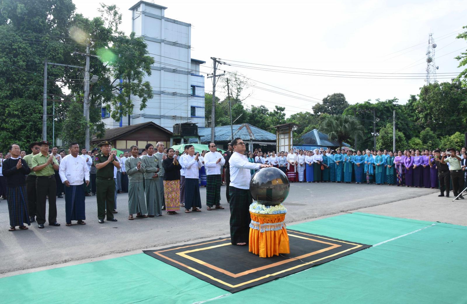 ထို့နောက် ပြည်နယ်ဝန်ကြီးချုပ်က ပြည်သူလူထုတစ်ရပ်လုံး လိုလားတောင့်တသည့် ပါတီစုံ ဒီမိုကရေစီစနစ်ကို အောင်မြင်စွာ လျှောက်လှမ်းနိုင်ရေးသည် ပြည်သူလူထု၏ ပူးပေါင်းပါဝင်မှုဖြင့် အကောင်အထည်ဖော်ဆောင်ရွက်ရမည်ဖြစ်သည့်အတွက် မဲဆန္ဒရှင်ပြည်သူများကို ရွေးကောက်ပွဲ ဆိုင်ရာအသိပညာပေးခြင်းများ ဆောင်ရွက်ပေးလျက်ရှိပါကြောင်း၊ ယနေ့တွင် ပြည်နယ်အတွင်းရှိ မြို့နယ်များအလိုက် မဲဆန္ဒရှင်အသိပညာပေး မြေစိုက်ပိုစတာများကို တစ်ပြိုင်တည်းစိုက်ထူဆောင် ရွက်နေပြီဖြစ်ပါကြောင်း၊ ထို့အပြင် ရွေးကောက်ပွဲကော်မရှင်အဖွဲ့အဆင့်ဆင့်အနေဖြင့်လည်း မဲဆန္ဒရှင်စာရင်းများကို ပထမအကြိမ်အဖြစ် ထုတ်ပြန်ကြေညာလျက်ရှိသည့်အတွက် မဲရုံအလိုက် မဲစာရင်းများကို မဖြစ်မနေ သွားရောက်ကြည့်ရှုပေးကြရန် လိုအပ်မည်ဖြစ်ပါကြောင်း၊ မိမိအနေဖြင့် မြေစိုက် ပိုစတာတွင်ပါသည့်အတိုင်း “နိုင်ငံသားအခွင့်အရေး မဆုံးရှုံးဖို့ မဲပေးကြပါစို့” ဟု အလေးအနက်ထား တိုက်တွန်းလိုပါကြောင်း ပြောကြားခဲ့ပြီး ပြည်နယ်/ ခရိုင်/ မြို့နယ် ရွေးကောက်ပွဲကော်မရှင်အဖွဲ့ခွဲ ဥက္ကဋ္ဌများ၊ အဖွဲ့ဝင်များနှင့်အတူ အမှတ်တရ စုပေါင်းမှတ်တမ်းတင်ဓာတ်ပုံရိုက်ကူးခဲ့ကြသည်။