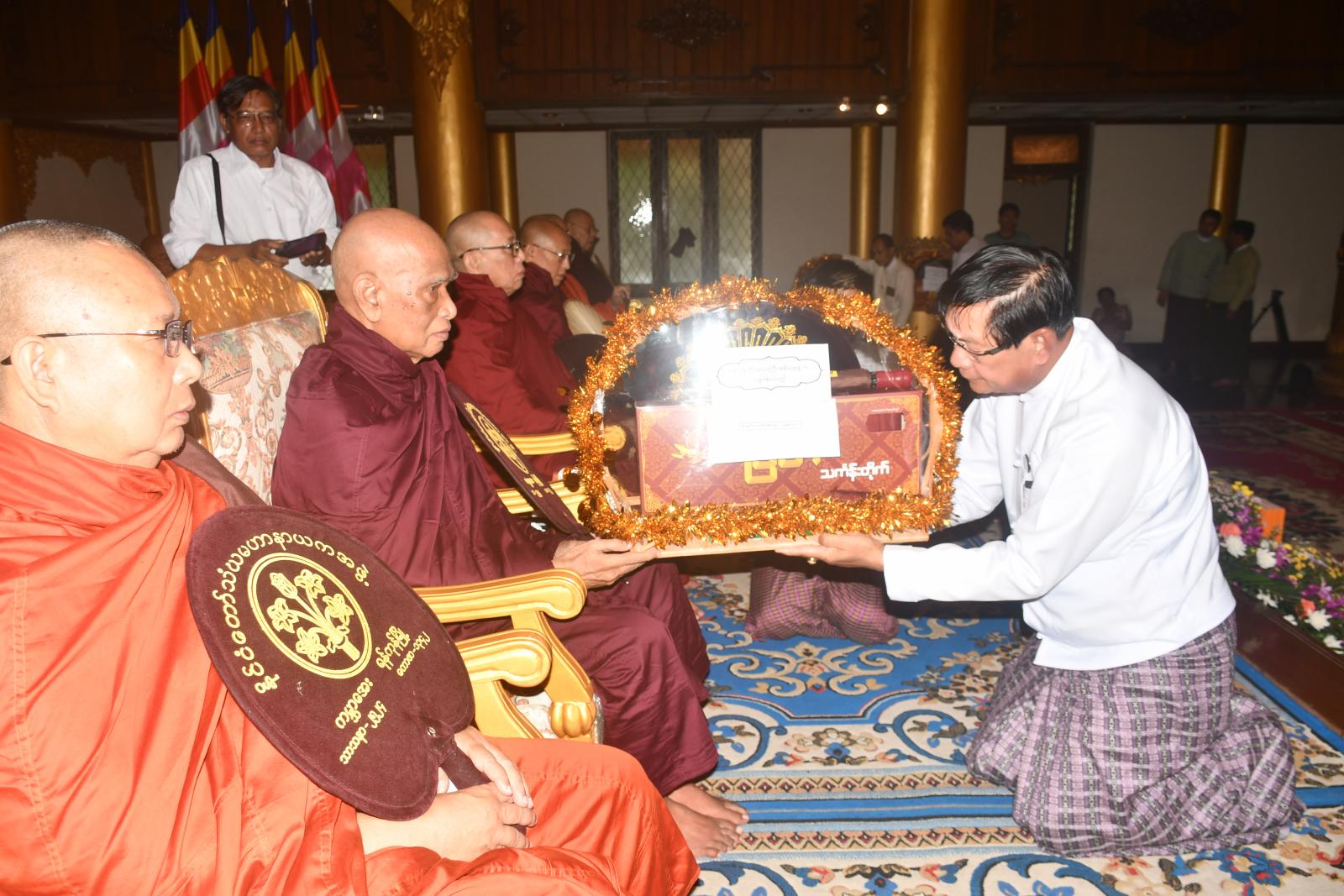 ယင်းနောက် နိုင်ငံတော်သံဃမဟာနာယကအဖွဲ့ဥက္ကဋ္ဌ ဆရာတော်ကြီးအမှူးပြုသော ဆရာတော် ကြီးများအား ရန်ကုန်တိုင်းဒေသကြီး ဝန်ကြီးချုပ် ဦးစိုးသိန်းနှင့်တိုင်းဒေသကြီး အစိုးရအဖွဲ့ဝင်များ၊ တာဝန်ရှိသူများနှင့် အလှူရှင်များက လှူဖွယ်ဝတ္ထုပစ္စည်းများ ဆက်ကပ်လှူဒါန်းကြသည်။