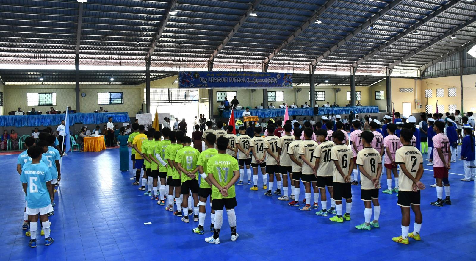 ကချင်ပြည်နယ်အတွင်းမှ ဖူဆယ်ဘောလုံးမျိုးဆက်သစ်အားကစားများ ပေါ်ထွန်းလာစေရေး ရည်ရွယ်ကျင်းပပြုလုပ်သည့် ကချင်ပြည်နယ်ဝန်ကြီးချုပ်ဖလား အသက်(၁၅)နှစ်အောက် အမျိုးသား ကလပ်ပေါင်းစုံ ဖူဆယ်ဘောလုံးလိဂ်ပြိုင်ပွဲ ဖွင့်ပွဲအခမ်းအနားကို ငြိမ်းချမ်းသာယာဖူဆယ်အားကစားရုံ၌ ကျင်းပပြုလုပ်ရာ ပြည်နယ်ဝန်ကြီးချုပ် ဦးခက်ထိန်နန် တက်ရောက်ဖွင့်လှစ်ပေးသည်။