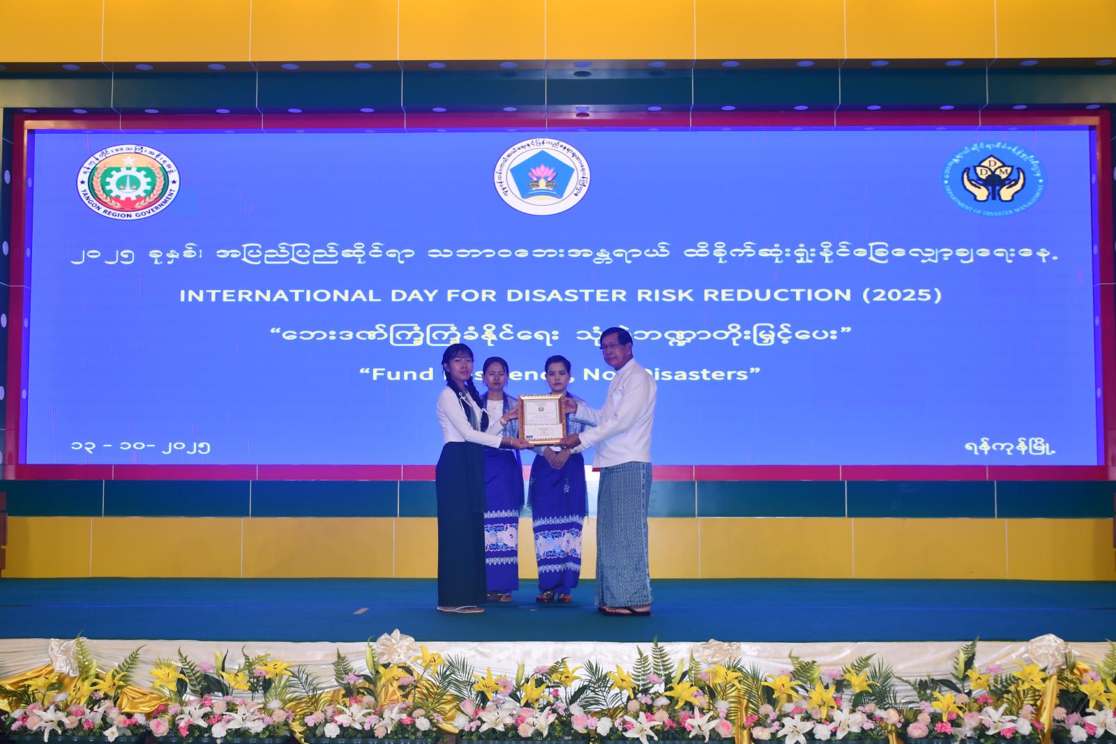 ဆက်လက်၍ ၂၀၂၅ ခုနှစ်၊ အပြည်ပြည်ဆိုင်ရာသဘာဝဘေးအန္တရာယ် ထိခိုက်ဆုံးရှုံးနိုင်ခြေလျှော့ချရေးနေ့အထိမ်းအမှတ် “ဘေးဒဏ်ကြံ့ကြံ့ခိုင်နိုင်ရေး၊ သုံးစွဲဘဏ္ဍာတိုးမြှင့်ပေး” ခေါင်းစဉ်ဖြင့် စာစီစာကုံးပြိုင်ပွဲ၌ အထက်တန်းအဆင့်၊ အလယ်တန်းအဆင့်နှင့် မူလတန်းအဆင့်တို့တွင် ပထမ၊ ဒုတိယ၊ တတိယဆုများ ရရှိခဲ့ကြသူများကို ရန်ကုန်တိုင်းဒေသကြီးဝန်ကြီးချုပ် ဦးစိုးသိန်း၊ ရန်ကုန်တိုင်းဒေသကြီးတရားလွှတ်တော် တရားသူကြီးချုပ် ဒေါ်စန္ဒာသွယ်နှင့် ရန်ကုန်တိုင်းဒေသကြီး သယံဇာတရေးရာဝန်ကြီး ဦးဇော်ဝင်းတို့က ဆုများအသီးသီး ချီးမြှင့်ခဲ့ကြသည်။