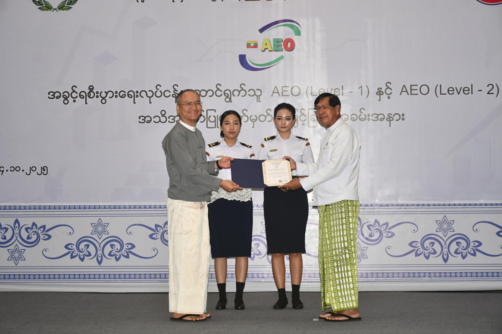 ဘဏ္ဍာရေးနှင့်အခွန်ဝန်ကြီးဌာန၊ အကောက်ခွန်ဦးစီးဌာန၊ အခွင့်ရစီးပွားရေးလုပ်ငန်းဆောင်ရွက်သူ (Authorized Economic Operators – AEO) အသိအမှတ်ပြုလက်မှတ် ချီးမြှင့်ခြင်း အခမ်းအနားကို ယမန်နေ့နံနက်ပိုင်းက ကုန်သည်များနှင့် စက်မှုလက်မှုလုပ်ငန်းရှင်များအသင်းချုပ် (UMFCCI) မင်္ဂလာခန်းမ၌ ကျင်းပသည်။