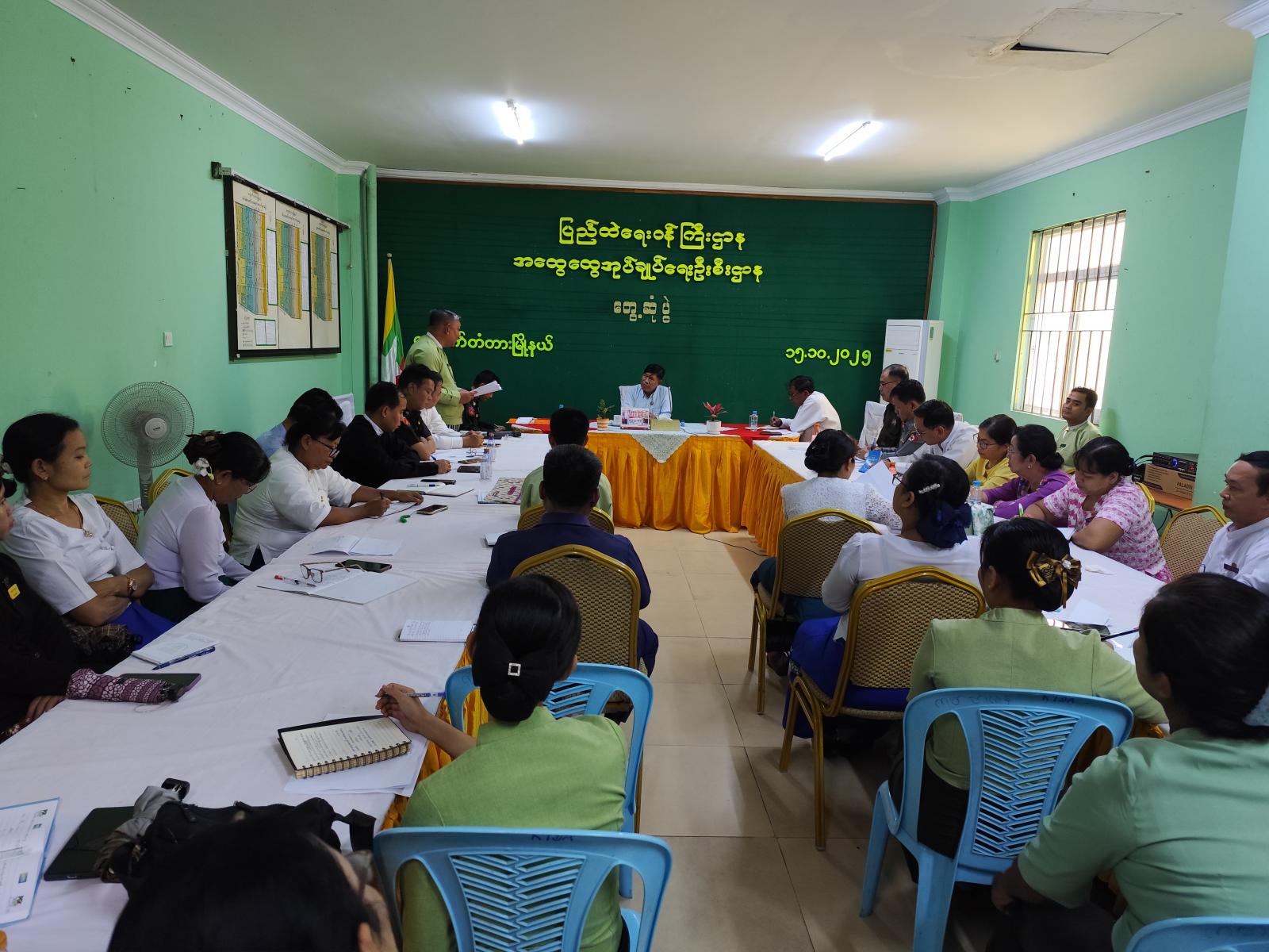ထို့နောက် မြို့နယ်စီမံခန့်ခွဲရေးနှင့်အုပ်ချုပ်ရေးကော်မတီဥက္ကဋ္ဌ ဦးမိုးထွေးဦးက မြို့နယ်ရှိ အခြေခံလူဦးရေစာရင်းနှင့် မဲစာရင်းကြေညာသည့်လူဦးရေ ကွာခြားချက်များနှင့်ဌာနဆိုင်ရာဝန်ထမ်းများ သတ်မှတ်ပုံစံများဖြင့် ဆန္ဒမဲပေးနိုင်ရေး ဆောင်ရွက်ပေးနေသည့်ကိစ္စရပ်များ၊ ယာယီနေရပ်စွန့်ခွာ ပြည်သူများအား ဆန္ဒမဲပေးပိုင်ခွင့်မဆုံးရှုံးစေရေး ဆောင်ရွက်ပေးနေမှုများ၊ ဆန္ဒမဲပေးပိုင်ခွင့်ရှိသူများ မဲပေးပိုင်ခွင့်မဆုံးရှုံးစေရေးအတွက် ဆောင်ရွက်ပေးနေမှုများကို ရှင်းလင်းတင်ပြပြီးနောက် မြို့နယ်ရွေးကောက်ပွဲကော်မရှင်အဖွဲ့ခွဲ အတွင်းရေးမှူး ဒေါ်မေဖူးမြင့်ခိုင်နှင့် အစည်းအဝေးတက်ရောက်လာကြသူများက ရွေးကောက်ပွဲအောင်မြင်စွာကျင်းပနိုင်ရေးအတွက် ဆောင်ရွက်နေမှုများကို ရှင်းလင်းတင်ပြသည်။