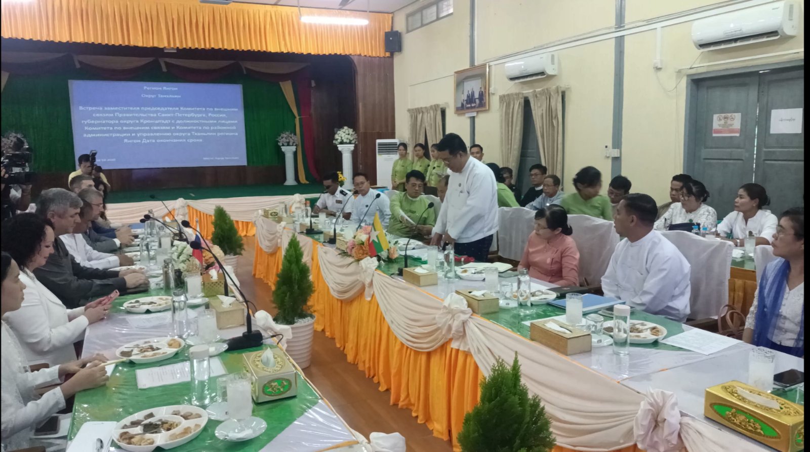 ရန်တိုင်းဒေသကြီး၊သန်လျင်ခရိုင် သန်လျင်မြို့၌ ရန်ကုန်တိုင်းဒေသကြီးလူမှုရေးရာဝန်ကြီး ဦးဌေးအောင်နှင့် ရုရှားနိုင်ငံ စိန့်ပီတာစဘတ်ဒေသ ပြည်ပဆက်ဆံရေးကော်မတီ ဒုတိယဥက္ကဋ္ဌနှင့်အဖွဲ့များ၊ သန်လျင်ခရိုင် စီမံခန့်ခွဲရေးနှင့် အုပ်ချုပ်ရေးကော်မတီဥက္ကဋ္ဌ ဦးအောင်သိုက်ဝင်းနှင့် ခရိုင်အဆင့်ဌာနဆိုင်ရာများ တွေ့ဆုံပွဲကို ယမန်နေ့မွန်းလွဲပိုင်းက အထွေထွေအုပ်ချုပ်ရေးဦးစီးဌာန ရှင်စောပုခန်းမ၌ ကျင်းပသည်။