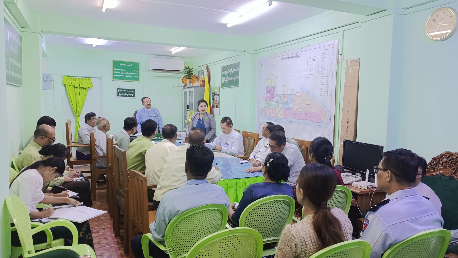 ထို့နောက် ရန်ကုန်တိုင်းဒေသကြီး၊ ရွေးကောက်ပွဲကော်မရှင်ဥက္ကဋ္ဌက ရွေးကောက်ပွဲဆိုင်ရာ ကိစ္စရပ်များနှင့်စပ်လျဉ်း၍ မဲစာရင်းမှန်ကန်စေရေး မဲပေးစက်ဖြင့်မဲပေးခြင်း၏ အကျိုးကျေးဇူးများကို အကျယ်တဝင့်ဆွေးနွေးပြောကြားပြီး လုပ်ငန်းများ အောင်မြင်စွာ ဆောင်ရွက်နိုင်ရေးအတွက် မဲစာရင်းမှန်ကန်စေရေး အချိန်မီပြီးစီးရေး လိုအပ်ချက်များရှိပါက အကူအညီပေးရန် အဓိကလာရောက်ရခြင်းဖြစ်ကြောင်း လိုအပ်သည်များရှိက တင်ပြပေးကြရန် စသဖြင့် လမ်းညွှန်ဆွေးနွေးပြောကြားခဲ့သည်။