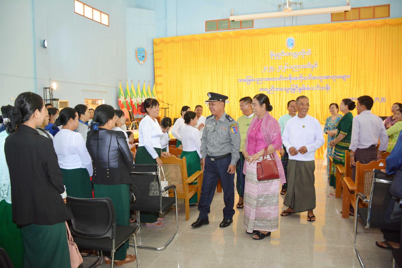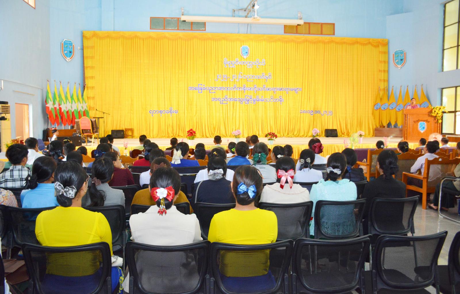 ဆက်လက်၍ ခရိုင်ပညာရေးမှူးရုံးမှ ခရိုင်ပညာရေးမှူး ဦးမွန်ကျော်မြင့်က အခြေခံပညာအထက်တန်းအဆင့်သင် ဆရာ၊ ဆရာမများအား သင်ထောက်ကူပစ္စည်းများ လက်တွေ့အသုံးချသင်ကြားနိုင်ရေး အရည်အသွေးမြှင့်မွမ်းမံသင်တန်းသို့ တက်ရောက်လာသည့် မိုးညှင်းမြို့နယ်နှင့် ဖားကန့်မြို့နယ်တို့မှ ဆရာ၊ ဆရာမများ စုစုပေါင်း(၁၅၁)ဦးအား သင်တန်းဆိုင်ရာ စည်းမျဉ်း၊ စည်းကမ်းများနှင့်ပတ်သက်၍ ရှင်လင်းပြောကြားသည်။