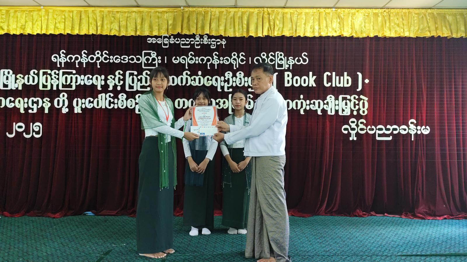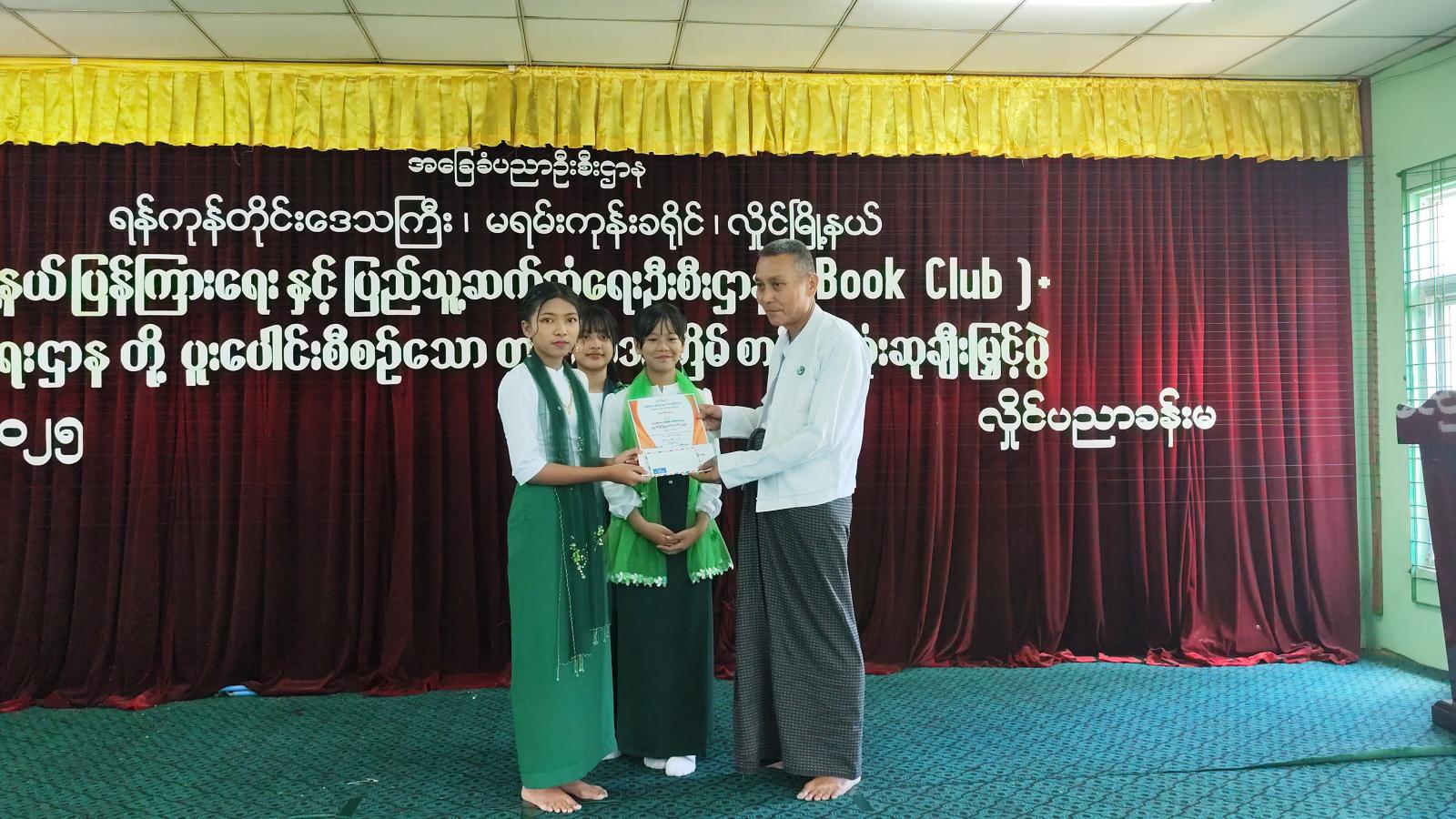 ထို့နောက် အခြေခံပညာမူလတန်းအဆင့်၊အလယ်တန်းအဆင့် စာစီစာကုံးပြိုင်ပွဲတွင်ဆုရရှိသော ကျောင်းသား၊ ကျောင်းသူများအား ပြန်ကြားရေးနှင့်ပြည်သူ့ဆက်ဆံရေးဦးစီးဌာနမှဦးစီးမှူး ဦးညိုထွန်း၊ လှိုင်မြို့နယ် အမျိုးသမီးရေးရာအဖွဲ့ဥက္ကဋ္ဌ ဒေါ်တင်ဝင်းရီ၊ လှိုင်မြို့နယ် စာရေးဆရာအသင်း နာယကဆရာမင်းဆက်ပိုင်၊ လှိုင်မြို့နယ် စာပေချစ်သူများအဖွဲ့(Book Club)ဥက္ကဋ္ဌ ဦးသန်းကျော်နှင့် တာဝန်ရှိသူများမှ ဂုဏ်ပြုဆုလက်ဆောင်များ အသီးသီးချီးမြှင့်ခဲ့ကြပြီး အခမ်းအနားကို မင်္ဂလာပါသီချင်းဖြင့် ရုတ်သိမ်းခဲ့ကြောင်း သိရသည်။