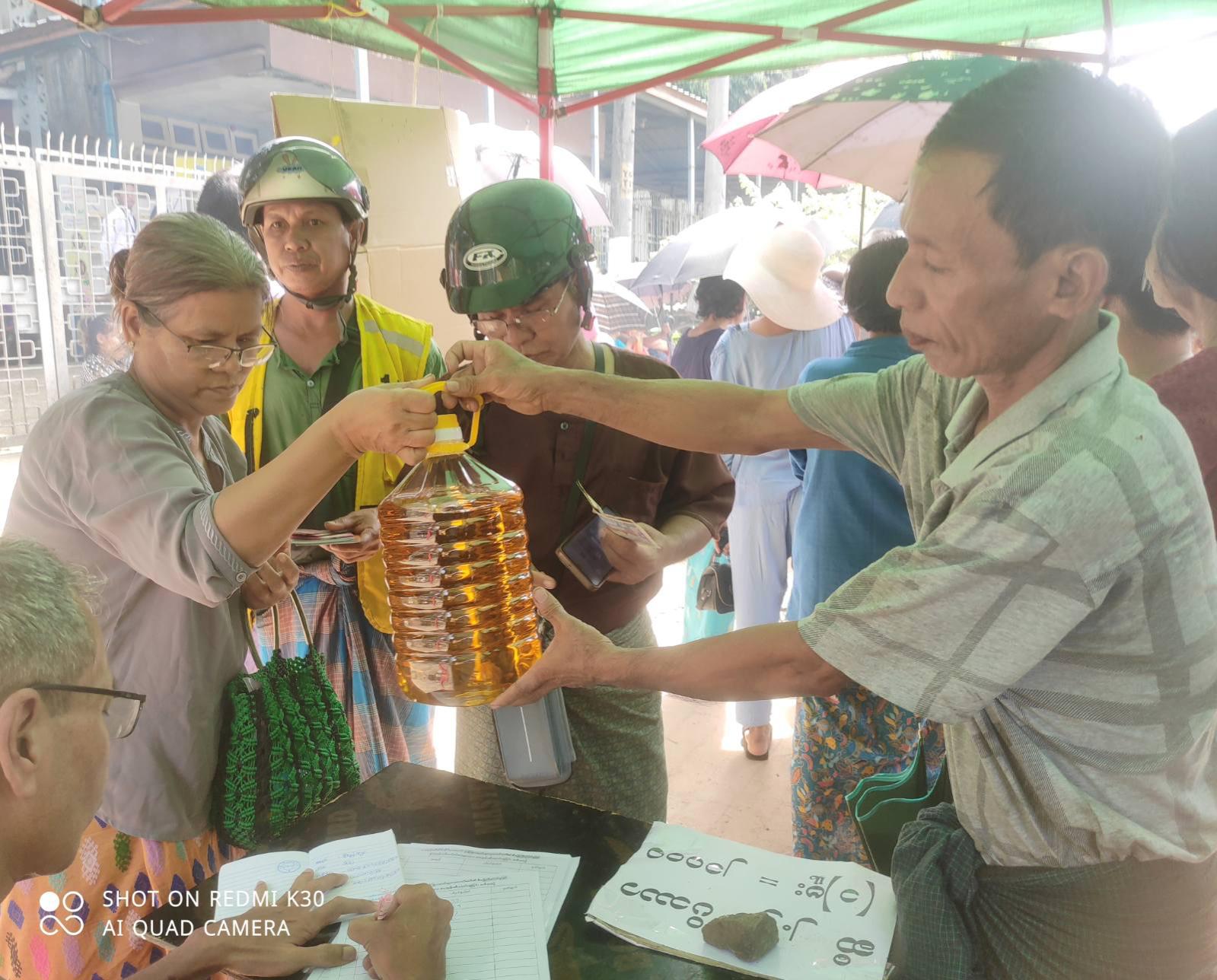 သန်လျင်ခရိုင် သန်လျင်မြို့နယ် မြန်မာ့စီးပွားရေးဘဏ်တွင် ပင်စင်လစာလာရောက်ထုတ်ယူ လျက်ရှိသော အငြိမ်းစားဝန်ထမ်းများအား မြန်မာနိုင်ငံဆီကုန်သည်နှင့်ဆီလုပ်ငန်းရှင်များ အသင်းက ယနေ့နံနက်ပိုင်းမှစ၍ စားအုန်းဆီများစျေးနှုန်းချိုသာစွာဖြင့် ရောင်းချပေးလျက်ရှိသည်။