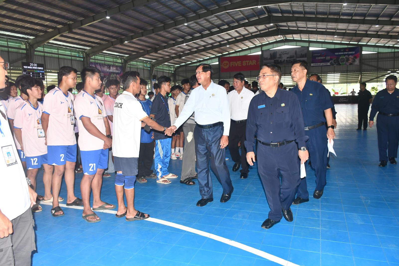 ရန်ကုန်မြို့တော်စည်ပင်သာယာရေးကော်မတီမှ ကြီးမှူး၍ YCDC INVITATION FUTSAL CUP 2025 ဖွင့်ပွဲ အခမ်းအနားကို ယနေ့ နံနက်ပိုင်းက သင်္ဃန်းကျွန်းမြို့နယ်၊ YCDC Sports Complex Centre တွင် ကျင်းပရာ ရန်ကုန်တိုင်းဒေသကြီး ဝန်ကြီးချုပ် ဦးစိုးသိန်း၊ တိုင်းဒေသကြီးအစိုးရအဖွဲ့ဝင်များ၊ ရန်ကုန်မြို့တော်စည်ပင်သာယာရေးကော်မတီမှ တာဝန်ရှိသူများ၊ ဌာနဆိုင်ရာ တာဝန်ရှိသူများ၊ ပြိုင်ပွဲဝင်အသင်းများမှ အုပ်ချုပ်သူ/ နည်းပြများ၊ အားကစားသမားများနှင့် တာဝန်ရှိသူများ တက်ရောက်ကြသည်။