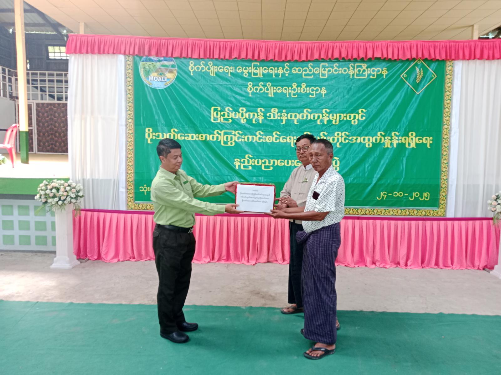 ဦးစွာ စိုက်ပျိုးရေးဦးစီးဌာန၊ ယာယီတိုင်းဒေသကြီးဦးစီးမှူး ဦးတင့်နိုင်က အဖွင့်အမှာစကား ပြောကြားခဲ့သည်။ ထို့နောက် စိုက်ပျိုးရေးဦးစီးဌာန (ရုံးချုပ်)၊ သီးနှံကာကွယ်ရေးဌာနခွဲမှ ညွှန်ကြားရေးမှူး ဦးဇော်လင်းက စိုက်ပျိုးရေးထုတ်ကုန်များ ကမ္ဘာ့ဈေးကွက်တွင် ယှဉ်ပြိုင်နိုင်ရေးနှင့် ပြည်တွင်းစားသုံးသူများ အစားအစာ ဘေးကင်းလုံခြုံမှုရှိရေးသည် အရေးကြီးကြောင်း၊ စိုက်ပျိုးသီးနှံများ၏ ပန်းတိုင်အထွက်နှုန်းရရှိရေး ကြိုးပမ်းဆောင်ရွက်ရန် လိုအပ်သကဲ့သို့ ထွက်ရှိလာသော သီးနှံထုတ်ကုန်များတွင် ပိုးသတ်ဆေး ဓာတ်ကြွင်းကင်းစင်ရေးသည်လည်း အရေးကြီးပါကြောင်း၊ ဝန်ထမ်းများ၊ သီးနှံစိုက်တောင်သူများ၊ ပိုးသတ်ဆေးအရောင်းဆိုင်များ၊ ဝယ်ယူကြိတ်ခွဲသိုလှောင်ရောင်းချသူများ၊ စိုက်ပျိုးရေးထွက်ကုန်များကို တင်ပို့ရောင်းချနေသူများ၊ သက်ဆိုင်ရာဌာနမှ တာဝန်ရှိသူများ အတူတကွ ပူးပေါင်းဆောင်ရွက်ပါက ပိုးသတ်ဆေးဓာတ်ကြွင်း ကင်းစင်သော သီးနှံများကို ထုတ်လုပ်နိုင်မည်ဖြစ်ပါကြောင်း ပြောကြားခဲ့ပြီး မြို့နယ်စီမံခန့်ခွဲရေးနှင့် အုပ်ချုပ်ရေးကော်မတီဥက္ကဋ္ဌ ဦးဇော်မျိုးဝင်းက စပါးနှင့် ပဲတီစိမ်းတွင် ပိုးသတ်ဆေးဓာတ်ကြွင်း ကင်းစင်ရေးအတွက် စမ်းသပ်ကွက်ဆောင်ရွက်ရန် ပိုးသတ်ဆေး၊ မှိုသတ်ဆေးနှင့် ပေါင်းသတ်ဆေးများကို တောင်သူလယ်သမားများထံ ပံ့ပိုးပေးအပ်ခဲ့ကြောင်း သိရသည်။