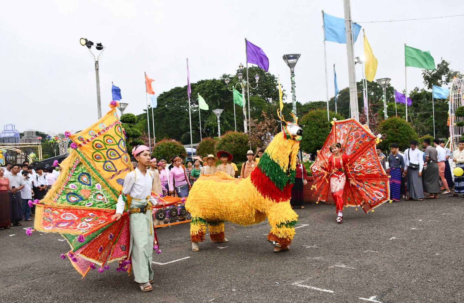 ဆက်လက်၍ တိုင်းရင်းသားရိုးရာ အကအဖွဲ့များက ဖျော်ဖြေတီးခတ်တင်ဆက်ကပြကြရာ တိုင်းဒေသကြီးဝန်ကြီးချုပ်က ဖျော်ဖြေရေးအဖွဲ့များအား ဂုဏ်ပြုချီးမြှင့်ငွေများ ပေးအပ် သည်။