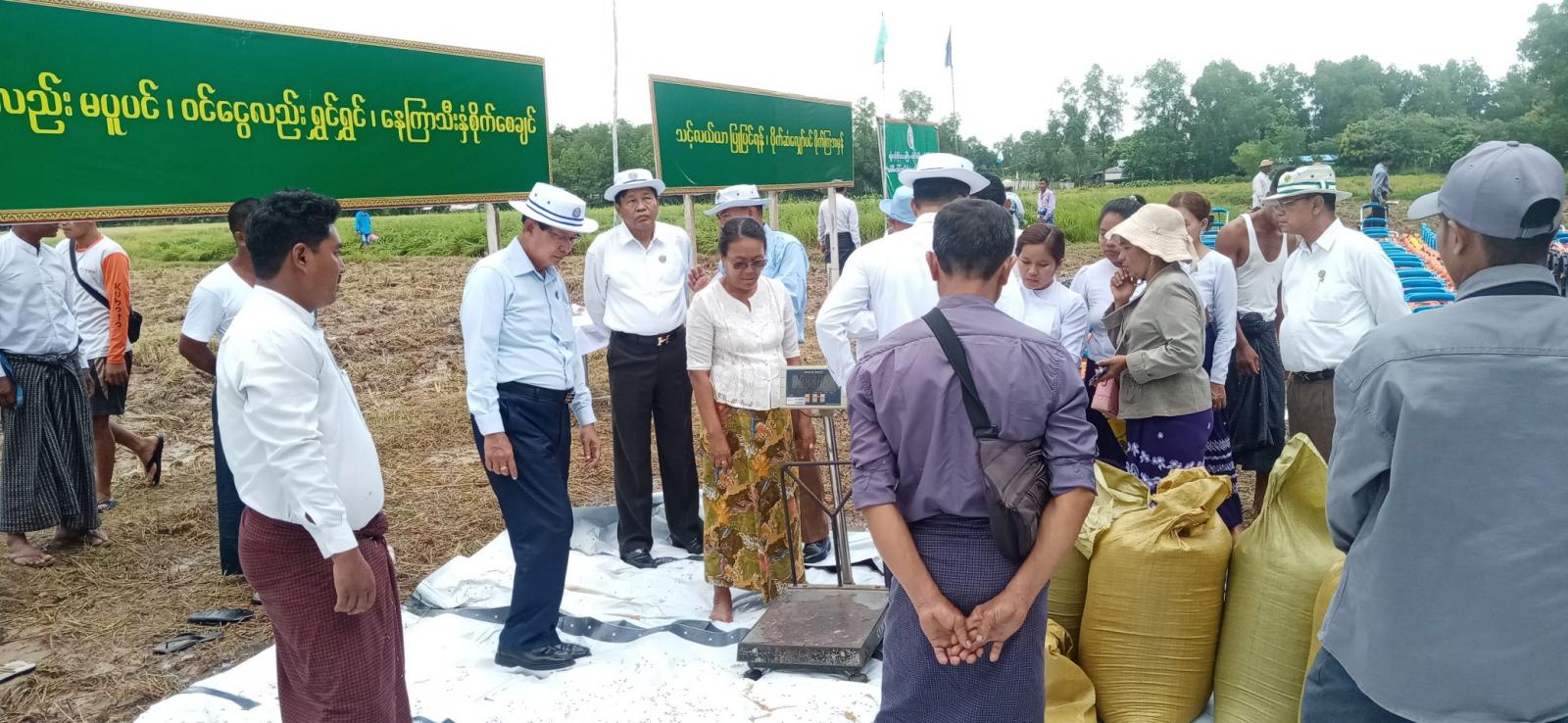 ယနေ့မိုးစပါးစံကွက်ရိတ်သိမ်းပွဲကို ဦးပိုင်အမှတ်၊၃၄/၄၊ကွင်းအမှတ်၊ ၆၆၅တောင်သူ ဒေါ်အေးအေးပိုင်၏ လယ်တွင် ရိတ်သိမ်းရာ(၁)ဧကလျှင် စပါးအခြောက်ထွက်နှုန်း တင်း ၁၃၀ ထွက်ရှိကြောင်း သိရသည်။