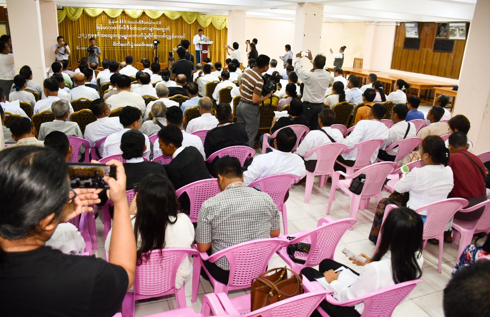 ဦးစွာ ရန်ကုန်တိုင်းဒေသကြီး လူမှုရေးရာဝန်ကြီး ဦးဌေးအောင်က အထွေထွေရွေးကောက်ပွဲဆိုင်ရာ လမ်းညွှန်စာအုပ် ဖြန့်ဝေမှုနှင့် ပတ်သက်၍ မုဒိတာစကား ပြောကြားသည်။