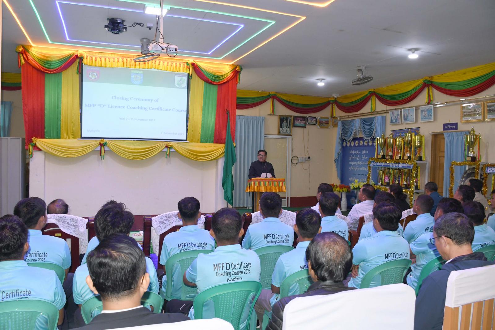 ထို့အပြင် ပြည်နယ်ဝန်ကြီးချုပ်သည် နံနက်ပိုင်းကလည်း မြစ်ကြီးနားမြို့ ပြည်သူ့အားကစား ကွင်းအတွင်းရှိ ပြည်နယ်အားကစားနှင့်ကာယပညာဦးစီးဌာနရုံး၌ ကျင်းပပြုလုပ်သည့် မြန်မာနိုင်ငံ ဘောလုံးအဖွဲ့ချုပ် အသိအမှတ်ပြု D လိုင်စင်နည်းပြသင်တန်းအတွက် သင်တန်းဆင်းပွဲသို့ တက် ရောက်ခဲ့ကြပြီး ပြည်နယ်ဝန်ကြီးချုပ်က အမှာစကားပြောကြားသည်။ ထို့နောက် ပြည်နယ်ဝန်ကြီးချုပ်က သင်တန်းနည်းပြများအတွက် ကျေးဇူးတင်ဂုဏ်ပြုမှတ် တမ်းလွှာ၊ ဂုဏ်ပြုချီးမြှင့်ငွေနှင့် အမှတ်တရဂုဏ်ပြုလက်ဆောင်တို့ကို ပေးအပ်ချီးမြှင့်ခဲ့ပြီး ပြည်နယ်လူမှုရေးရာဝန်ကြီးနှင့်တာဝန်ရှိသူများက သင်တန်းသားများအား သင်တန်းဆင်းလက်မှတ်များကို ပေးအပ်ချီးမြှင့်ရာခဲ့ကြောင်း သိရသည်။