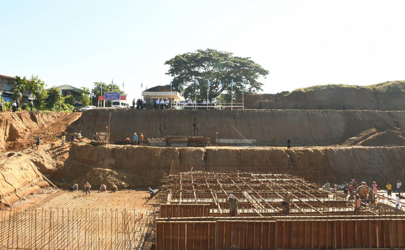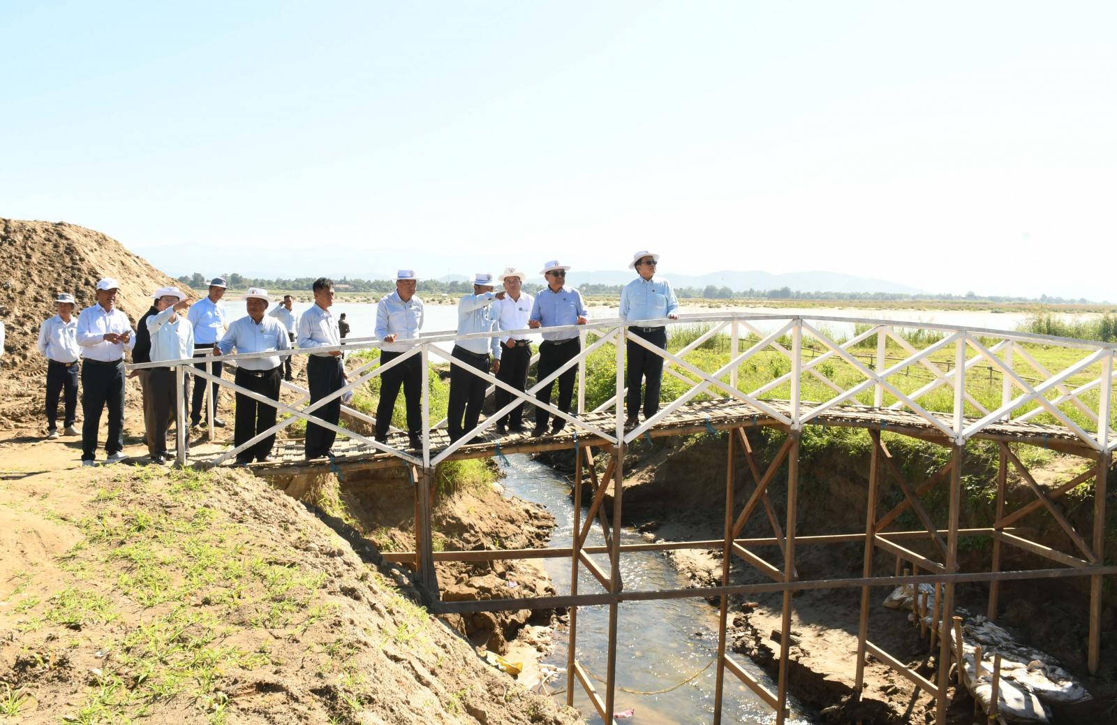 ထို့နောက် မြစ်ကြီးနားမြို့ စီတာပူရပ်ကွက် ဧရာဝတီမြစ်ဆိပ်ရှိ အင်ဂျန်းခချောင်းပေါက်နေရာ ၌ ၂၀၂၅-၂၀၂၆ ဘဏ္ဍာရေးနှစ် ကချင်ပြည်နယ်အစိုးရအဖွဲ့၏ ငွေလုံးငွေရင်းရန်ပုံငွေဖြင့် တည်ဆောက် လျက်ရှိသည့် အကျယ် (၈)ပေ၊ အမြင့် (၁၂)ရှိ ရေတံခါး (၃)ပေါက်ပါဝင်သည့် သံကူကွန်ကရစ်ရေထုတ် ရေထိန်းတံခါးတည်ဆောက်ရေး လုပ်ငန်းစီမံကိန်းနေရာသို့ သွားရောက်ခဲ့ကြပြီး စက်ယန္တရာကြီးများဖြင့် Apron သံကူကွန်ကရစ်လောင်းခြင်း၊ အောက်ခံကြမ်းခင်းကွန်ကရစ်လောင်းခြင်းနှင့် ရေထိန်းတံခါး အုတ်မြစ်တူးခြင်းလုပ်ငန်းများအပါအ ဝင် ရေလွှဲမြောင်းဖောက်လုပ်ပြီးစီးမှု အခြေအနေများကို လှည့်လည်ကြည့်ရှုစစ်ဆေးသည်။