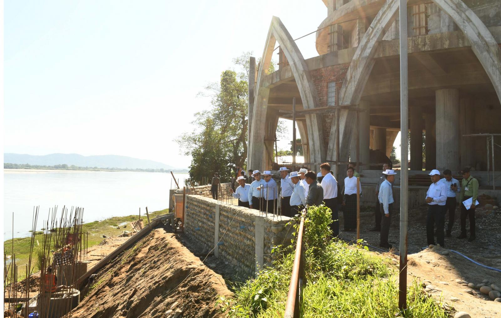 ထိုမှတစ်ဆင့် ပြည်နယ်ဝန်ကြီးချုပ်နှင့် အဖွဲ့ဝင်များသည် မြစ်ကြီးနားမြို့ ရှမ်းစုရပ်ကွက် အတွင်းရှိ ဓမ္မရက္ခိတဝန်းသိုလ် ကျောင်းတိုက်အနီး ဧရာဝတီမြစ်ကမ်းဘေး၌ ပြည်ထောင်စုငွေလုံး ငွေရင်းရန်ပုံငွေဖြင့် ရေအရင်းအမြစ်နှင့် မြစ်ချောင်းများဖွံ့ဖြိုးတိုးတက်ရေးဦးစီးဌာနက တာဝန်ယူ တည်ဆောက်လျက်ရှိသော ငြိမ်းချမ်းရေးဓာတ်တော်တိုက်စေတီ ကမ်းထိန်းလုပ်ငန်းစီမံကိန်းသို့ သွား ရောက်ပြီး ကြည့်ရှုစစ်ဆေးသည်။