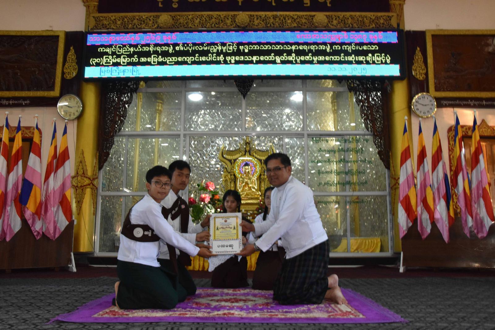 ထို့နောက် မြစ်ကြီးနားမြို့ သာသနာဗိမ္မာန်တော်ကြီး၌ မြို့နယ်ဗုဒ္ဓဘာသာသာသနာရေးအဖွဲ့က ကြီးမှူးကျင်းပလျက်ရှိသော အခြေခံပညာကျောင်းပေါင်းစုံ ဗုဒ္ဓဒေသနာတော်ရွတ်ဆိုပူဇော်ပြိုင်ပွဲ ဆုချီးမြှင့်ပွဲ အခမ်းအနားသို့ တက်ရောက်ခဲ့ကြပြီး အောက်တိုဘာ(၂၀)ရက်မှ (၃၀)ရက်အထိ ကျင်းပခဲ့သော ဆုရဝတ်အသင်းများအား ဂုဏ်ပြုချီးမြှင့်ငွေများကိုလည်းကောင်း၊ အလှူငွေများ ထည့်ဝင်လှူဒါန်းပေးကြသည့် အလှူရှင်များအား ကျေးဇူးတင်ဂုဏ်ပြုမှတ်တမ်းလွှာများကို လည်းကောင်း ချီးမြှင့်ပေးအပ်ခဲ့ကြသည်။