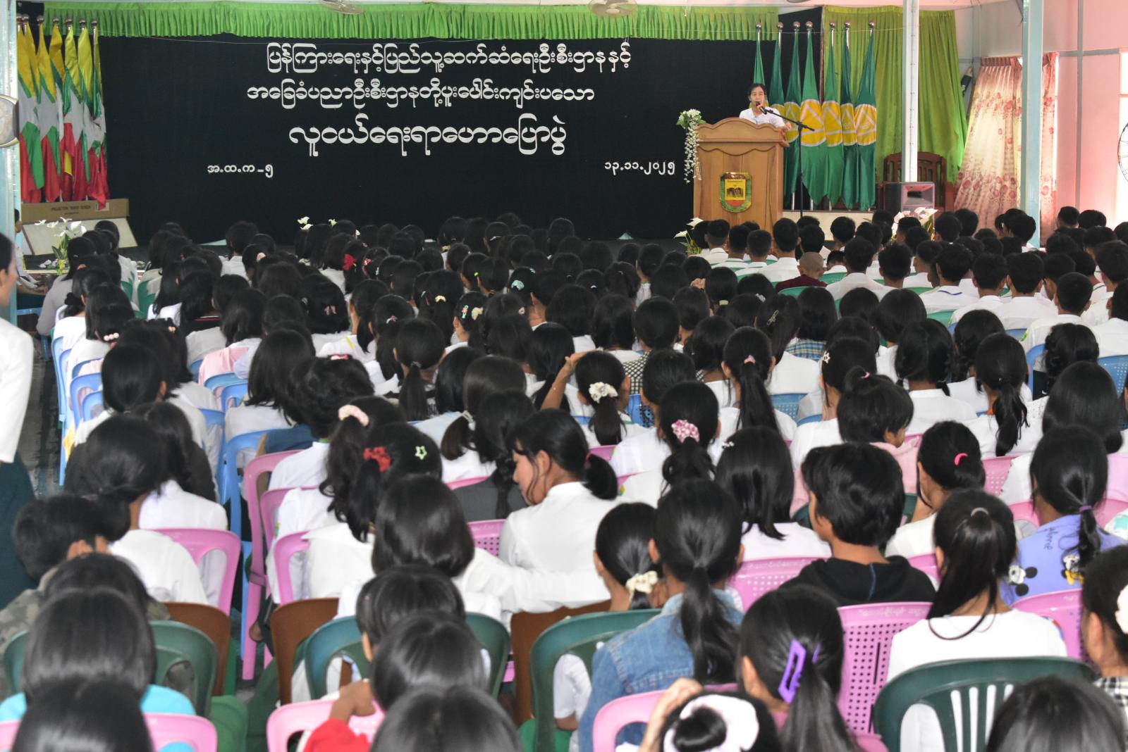 အစီအစဥ်အရ အမှတ် ၅ အခြေခံပညာအထက်တန်းကျောင်း၊ ကျောင်းအုပ်ဆရာမကြီး ဒေါက်တာညိုညိုတင်က တက်ရောက်လာသည့် ကျောင်းသား၊ ကျောင်းသူများအား ဆုံးမသြဝါဒစကားများနှင့် ဗဟုသုတများစွာရရှိနိုင်စေရန် အသိပညာပေးဟောပြောရာတွင် သေချာလိုက်နာ မှတ်သားရန်မှာကြားခဲ့သည်။