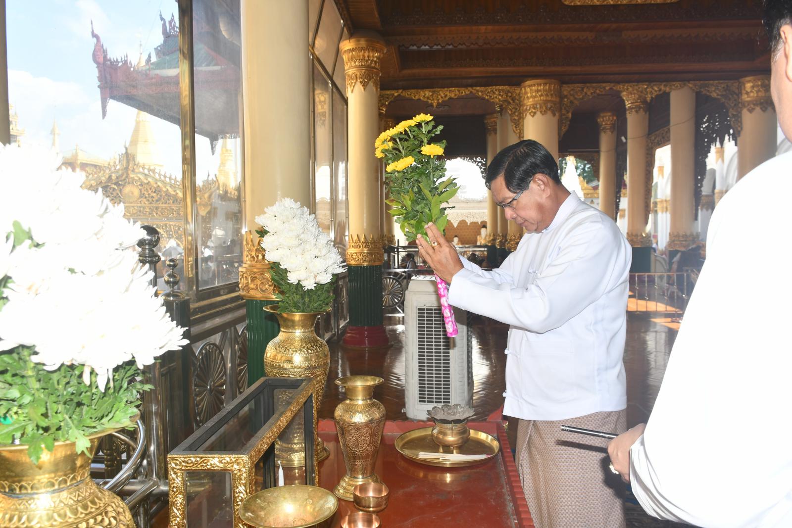 ဦးစွာ ရန်ကုန်တိုင်းဒေသကြီး ဝန်ကြီးချုပ် ဦးစိုးသိန်းနှင့် တိုင်းဒေသကြီးအစိုးရအဖွဲ့ဝင်များသည် ရွှေတိဂုံစေတီတော်တောင်ဘက် ဧည့်ခံတန်ဆောင်းတွင် ရွှေတိဂုံစေတီတော်မြတ်ကြီးအား ပန်း၊ ရေချမ်း၊ ဆီမီး များ ဆက်ကပ်လှူဒါန်းကြသည်။
