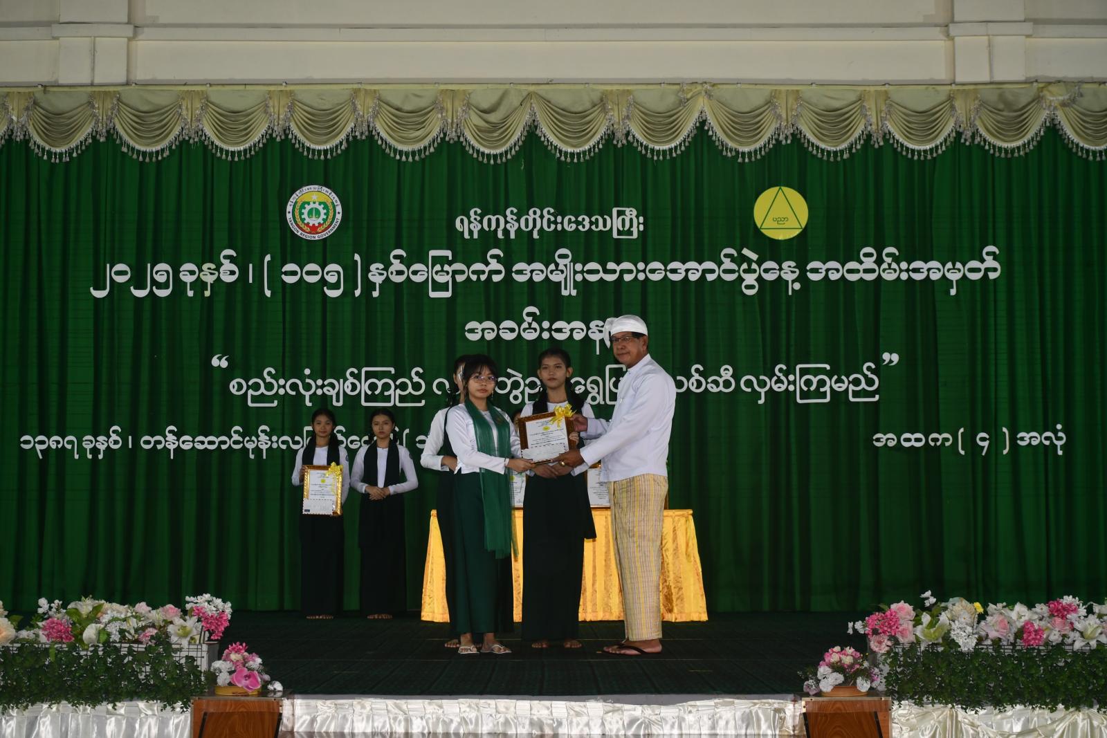 ဆက်လက်၍ အမျိုးသားအောင်ပွဲနေ့အထိမ်းအမှတ် အခြေခံပညာအထက်တန်းဆင့်နှင့် အလယ်တန်းအဆင့် စာစီစာကုံးပြိုင်ပွဲဆုရ ကျောင်းသား၊ ကျောင်းသူများအား ရန်ကုန်တိုင်းဒေသကြီးဝန်ကြီးချုပ် ဦးစိုးသိန်း၊ ရန်ကုန်တိုင်းဒေသကြီး တရားလွှတ်တော်တရားသူကြီးချုပ် ဒေါ်စန္ဒာသွယ်နှင့် လုံခြုံရေးနှင့်နယ်စပ်ရေးရာဝန်ကြီး ဗိုလ်မှူးကြီး ဝင်းတင့်တို့က ဆုများအသီးသီးချီးမြှင့်ပေးအပ်ကြသည်။