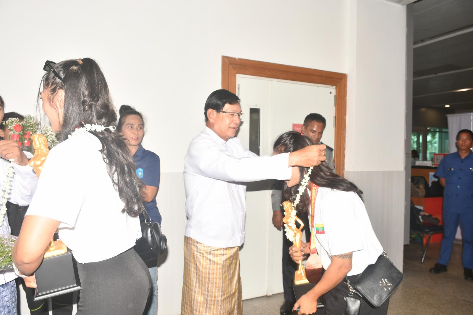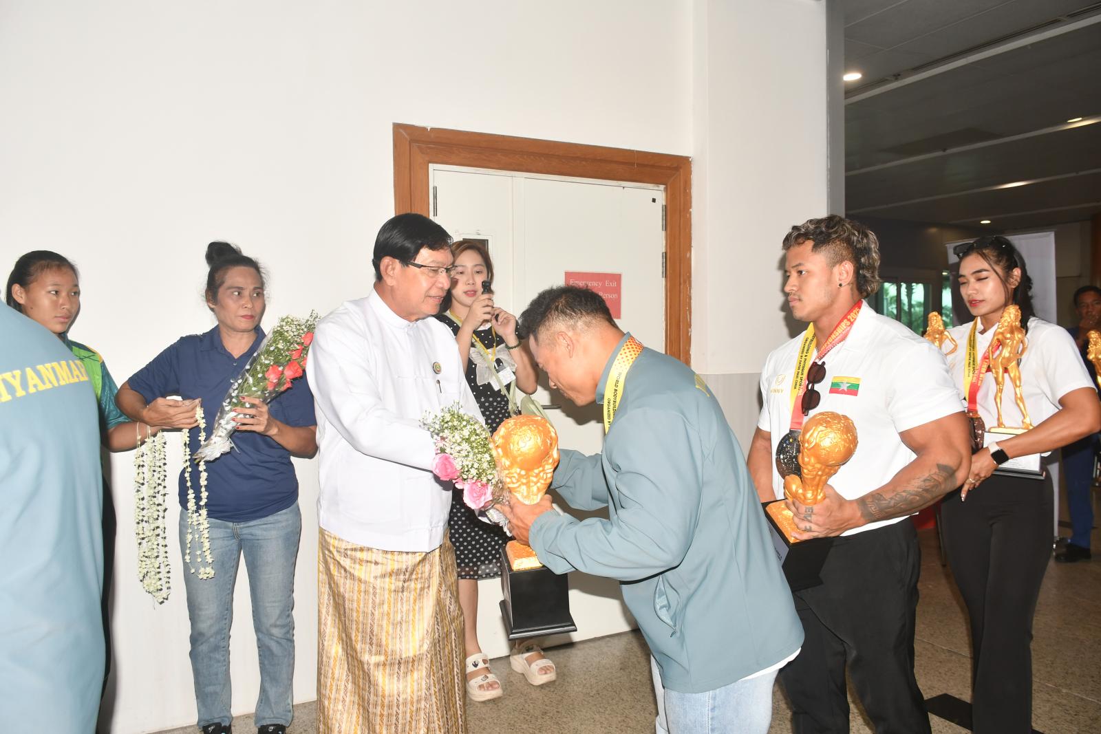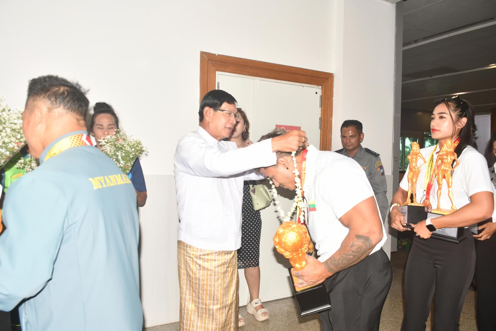အဆိုပါ နိုင်ငံ့ဂုဏ်ဆောင် မြန်မာ့ကာယဗလနှင့် ကာယကြံ့ခိုင်မှုအားကစားအဖွဲ့အား ရန်ကုန်တိုင်းဒေသကြီးဝန်ကြီးချုပ် ဦးစိုးသိန်း၊ တိုင်းဒေသကြီးအစိုးရအဖွဲ့ဝင်များ၊ အားကစားနှင့်ကာယပညာဦးစီးဌာနမှ တာဝန်ရှိသူများ၊ မြန်မာနိုင်ငံ ကာယဗလနှင့်ကာယကြံ့ခိုင်မှုအဖွဲ့ချုပ်မှ အလုပ်အမှုဆောင်များ၊ အားကစားနှင့်ကာယပညာသိပ္ပံ(ရန်ကုန်)မှ သင်တန်းသား/သင်တန်းသူများ၊ မိဘပြည်သူများနှင့် တာဝန်ရှိသူများက ဂုဏ်ပြုကြိုဆိုခဲ့ကြပြီး တိုင်းဒေသကြီးဝန်ကြီးချုပ်က နိုင်ငံ့ဂုဏ်ဆောင် မြန်မာ့ကာယဗလနှင့် ကာယကြံ့ခိုင်မှုအားကစားအဖွဲ့အား ဂုဏ်ပြုချီးမြှင့်ငွေများ ပေးအပ်သည်။