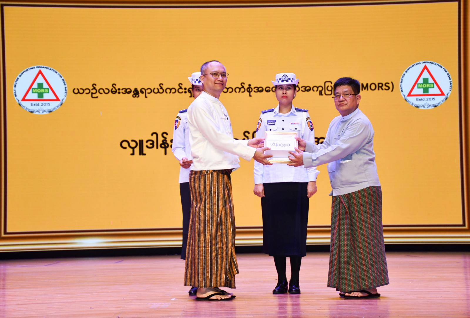 ထို့နောက် “ယာဉ်လမ်းအန္တရာယ်ကင်းရှင်းရေးချိန်ခါမရွေးဆောင်ရွက်ပေး” ကာတွန်း၊ ပန်းချီနှင့် ပိုစတာပြိုင်ပွဲတွင် ယှဉ်ပြိုင်ရေးဆွဲခဲ့သောကျောင်းသူ/ကျောင်းသား ပထမ၊ ဒုတိယ၊ တတိယ ဆုရရှိသူများ အထက်တန်းအဆင့် ကာတွန်း (ပထမ/ဒုတိယ/တတိယ) ဆုရရှိသူများ၊ အလယ်တန်းအဆင့် ကာတွန်း (ပထမ/ဒုတိယ/တတိယ)ဆုရရှိသူများ၊ မူလတန်းအဆင့် ကာတွန်း (ပထမ/ဒုတိယ/တတိယ) ဆုရရှိသူများ၊ အထက်တန်းအဆင့်ပန်းချီ (ပထမ/ဒုတိယ/ယ) ဆုရရှိသူ များ၊ အလယ်တန်းအဆင့် ပန်းချီ (ပထမ/ဒုတိယ/တတိယ) ဆုရရှိသူများ၊မူလတန်းအဆင့်ပန်းချီ (ပထမ/ဒုတိယ/တတိယ) ဆုရရှိသူများ၊ ယာဉ်စည်းကမ်းထိန်းသိမ်းရေးကို စွမ်းစွမ်းတမံ ဆောင်ရွက်ခဲ့ကြသော ဝန်ထမ်း (၅)ဦး ယာဉ်ကြောပိတ်ဆို့တတ်သော နေရာများတွင် ချိန်ခါမရွေး စေတနာရှေ့ထားကာ လမ်းရှင်းပေးခဲ့သောပရဟိတ ဆောင်ရွက်သူ (၄)ဦး၊၂၀၂၅ ခုနှစ် ဇန်နဝါရီလ (၁)ရက်နေ့မှ အောက်တိုဘာလ (၃၁) ရက်နေ့အတွင်း ယာဉ်မတော်တဆမှုကြောင့် အပြင်းအထန် ထိခိုက်ဒဏ်ရာရရှိသူ(၁၀)ဦးနှင်ထောက်ပံ့ငွေများကို ရန်ကုန်တိုင်းဒေသကြီးဝန်ကြီးချုပ်နှင့် တိုင်းဒေသကြီးဝန်ကြီးများ၊ တာဝန်ရှိသူများက အသီးသီးပေးအပ်ခဲ့ကြသည်။