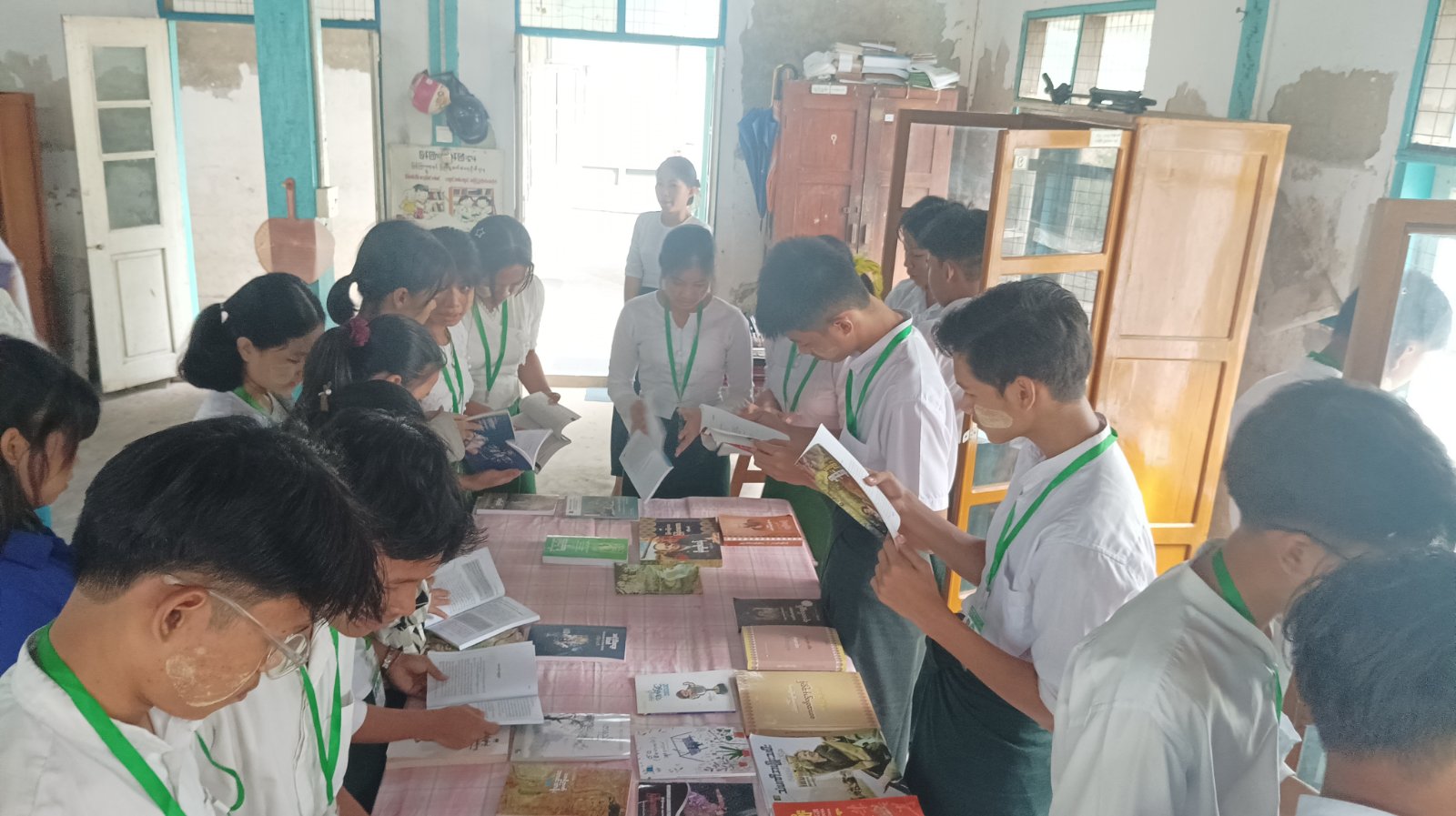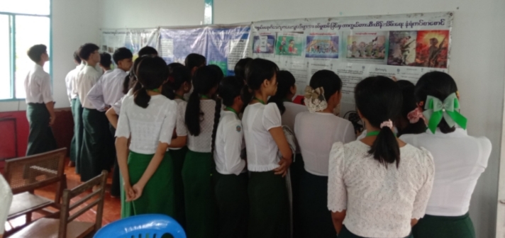 ဆက်လက်၍ ပြန်ကြားရေးနှင့်ပြည်သူ့ဆက်ဆံရေးဦးစီးဌာနမှ ခင်းကျင်းပြသထားသော အသိပညာပေးနံရံကပ်စာစောင်များ၊ စာအုပ်၊ စာစောင်များကို ကျောင်းသား၊ ကျောင်းသူများမှ စိတ်ပါ၀င်စားစွာ ဖတ်ရှုလျက်ရှိသည်။ ထို့နောက်စကားပုံဆက်ပြိုင်ပွဲများကိုလည်း ပျော်ရွှင်စွာ ကစားကြပြီး အမျိုးသမီးရေးရာအဖွဲ့ဥက္ကဋ္ဌက ကော်ဖီနှင့်မုန့်များဖြင့် ဧည့်ခံကျွေးမွေးလျက် ရှိသည်။