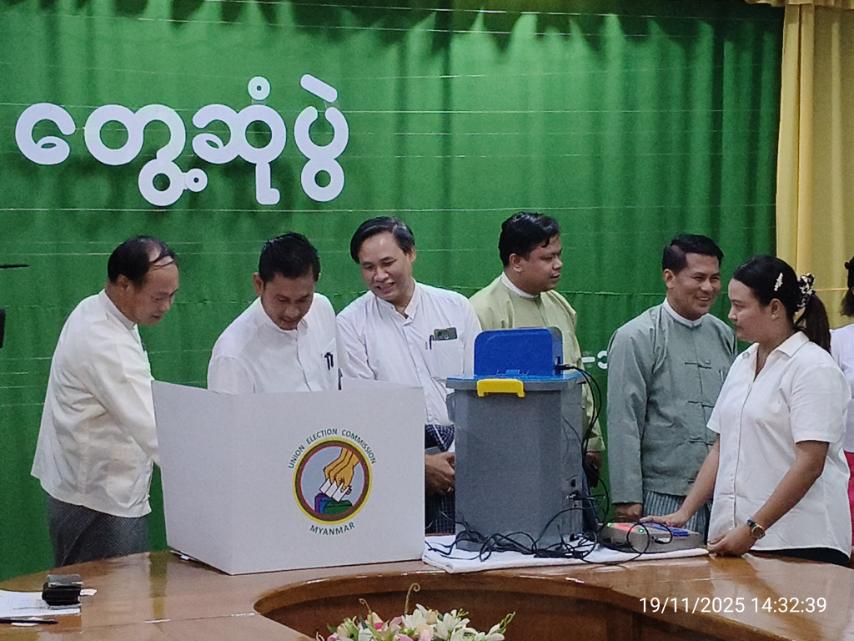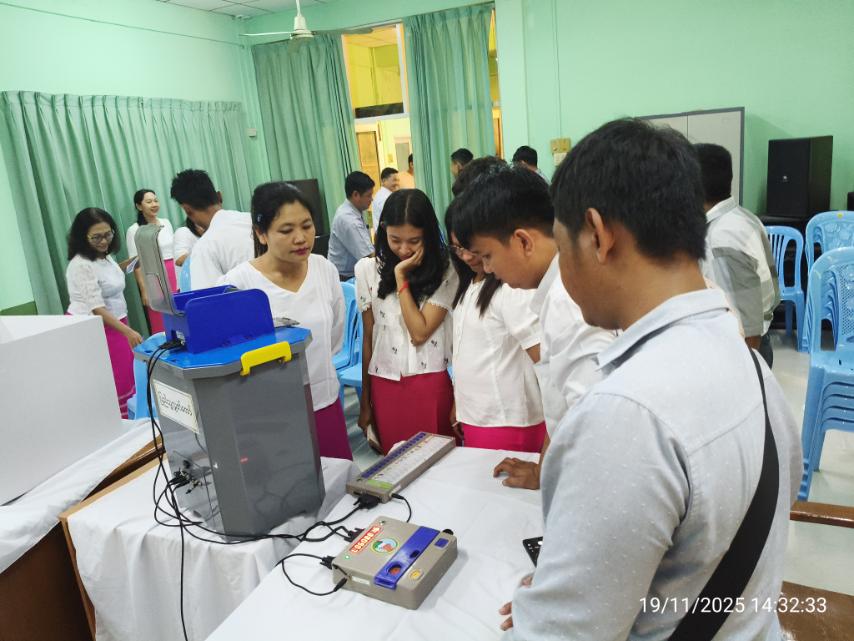 မန္တလေးတိုင်းဒေသကြီး မဟာအောင်မြေမြို့နယ် ချမ်းမြသာစည်မြောက်ရပ်ကွက်ရှိ ကုန်းလမ်း ပို့ဆောင်ရေးညွန်ကြားမှုဦးစီးဌာန ဝန်ထမ်းများအား မြန်မာအီလက်ထရောနစ်မဲပေးစက်(MEVM) ဖြင့် လက်တွေ့သရုပ်ပြစမ်းသပ်မဲပေးနည်းကို နိုဝင်ဘာ ၁၉ ရက် မွန်းလွဲပိုင်းက ဆောင်ရွက်သည်။