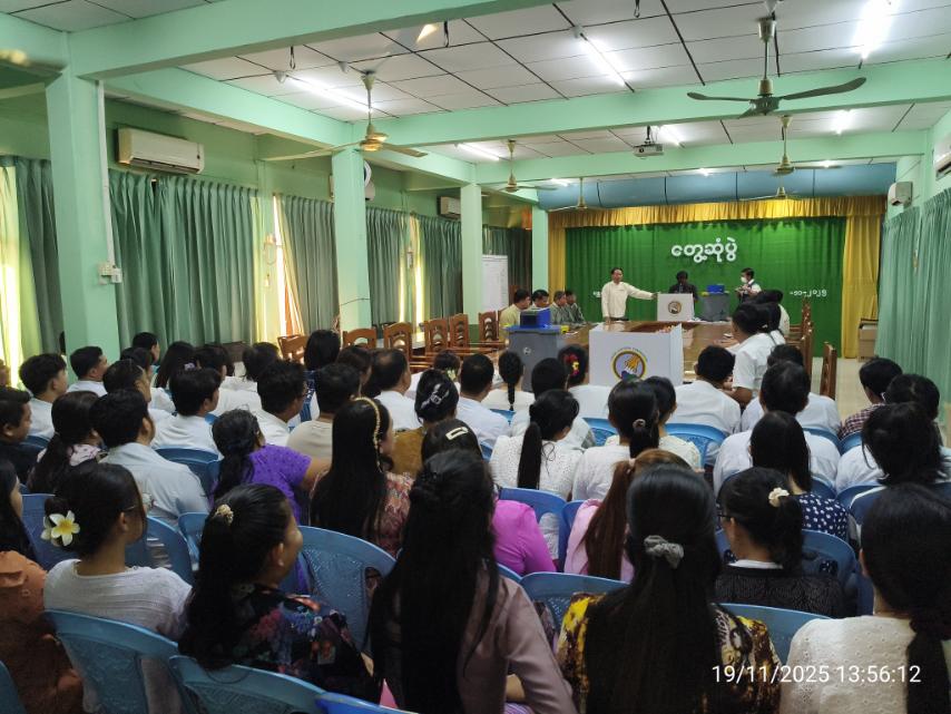ဦးစွာ မြို့နယ်ရွေးကောက်ပွဲကော်မရှင်အဖွဲ့ခွဲ ဥက္ကဋ္ဌ ဦးမျိုးဝင်းက မြန်မာအီလက်ထရောနစ်မဲပေးစက်(MEVM)ဖြင့် လက်တွေ့သရုပ်ပြစမ်းသပ်မဲပေးနည်းအသိပညာပေးခြင်း ဆောင်ရွက်ရသည့် ရည်ရွယ်ချက်ကို ရှင်းလင်းပြောကြားသည်။ ဆက်လက်၍ မြို့နယ်ရွေးကောက်ပွဲကော်မရှင်အဖွဲ့ခွဲအတွင်းရေးမှူး ဦးရဲမင်းလွင်က မြန်မာအီလက်ထရောနစ်မဲပေးစက် (MEVM)ဖြင့် လက်တွေ့သရုပ်ပြစမ်းသပ်မဲပေးနည်းအသုံးပြုပုံ၊ အသုံးပြုနည်းများအား ဆက်လက်ရှင်းလင်း ပြသသည်။