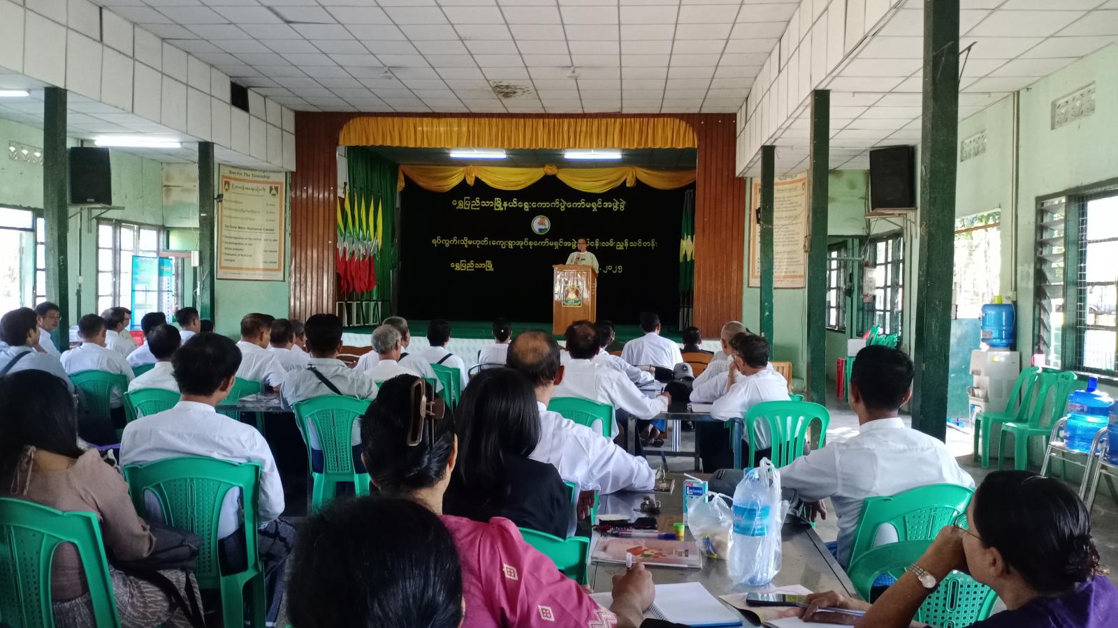 ရန်ကုန်တိုင်းဒေသကြီး၊ မင်္ဂလာဒုံခရိုင်၊ ရွှေပြည်သာမြို့နယ်တွင်၂၀၂၅ ခုနှစ်၊ ပါတီစုံဒီမိုကရေစီအထွေထွေရွေးကောက်ပွဲ အောင်မြင်စွာကျင်းပနိုင်ရေးအတွက် ရပ်ကွက်(သို့မဟုတ်) ကျေးရွာအုပ်စုကော်မရှင်အဖွဲ့ လုပ်ငန်းလမ်းညွှန်သင်တန်းကို ယမန်နေ့ နံနက် ၉ နာရီက အမှတ်(၆)ရပ်ကွက်၊ အမှတ်(၁)အခြေခံပညာအထက်တန်းကျောင်း၊ ရွှေပြည်ရတနာခန်းမ၌ ဖွင့်လှစ်သည်။