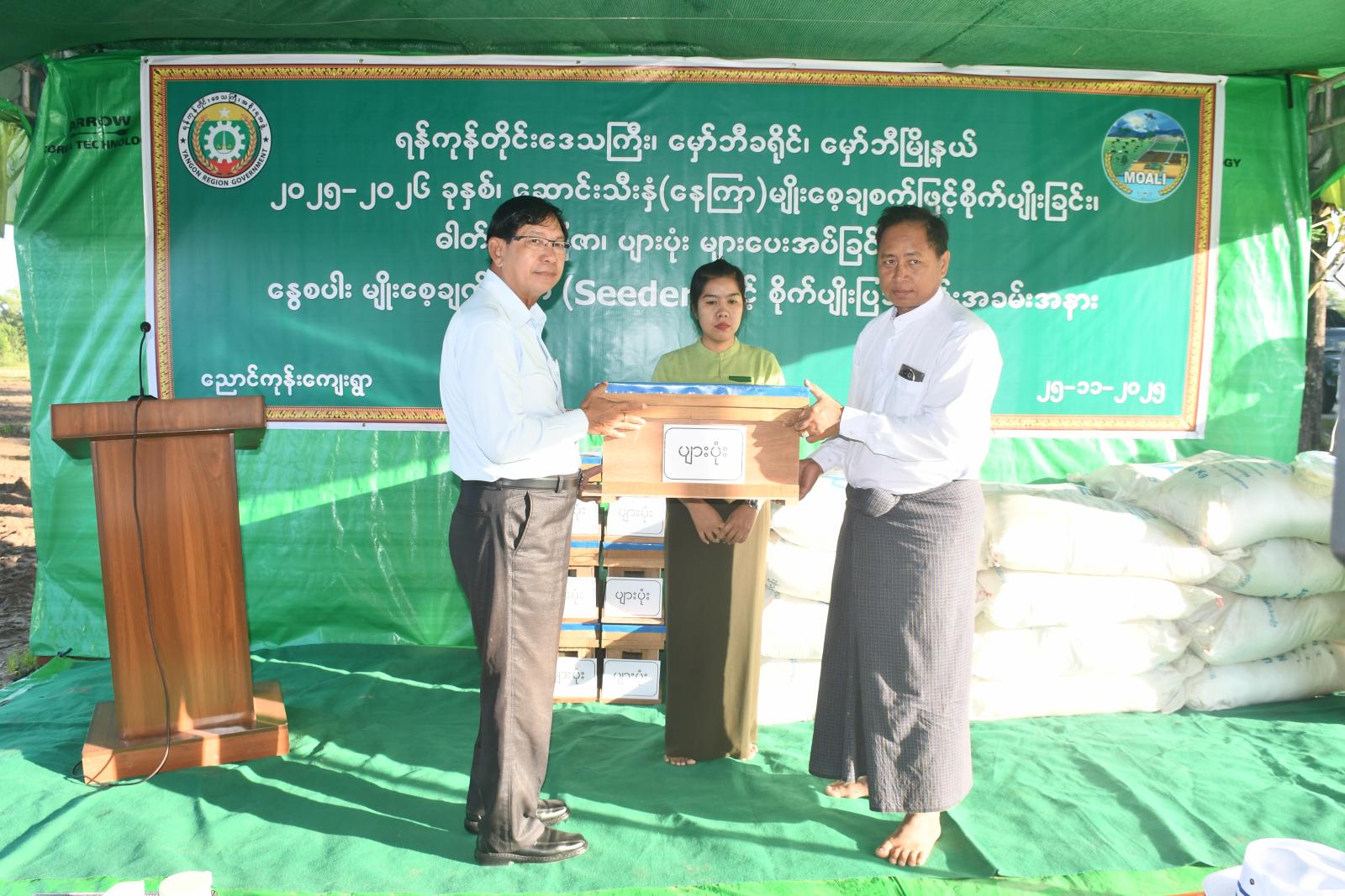 ဆက်လက်၍ ရန်ကုန်တိုင်းဒေသကြီး ဝန်ကြီးချုပ် ဦးစိုးသိန်းနှင့် တိုင်းဒေသကြီးအစိုးရအဖွဲ့ဝင်များက တောင်သူများအား ဓာတ်မြေဩဇာများနှင့် ပျားပုံးများကို ပေးအပ်ခဲ့ကြသည်။