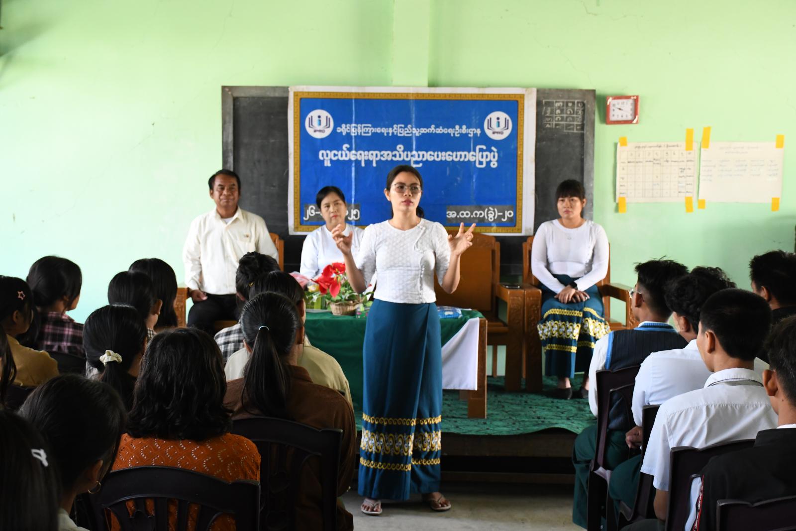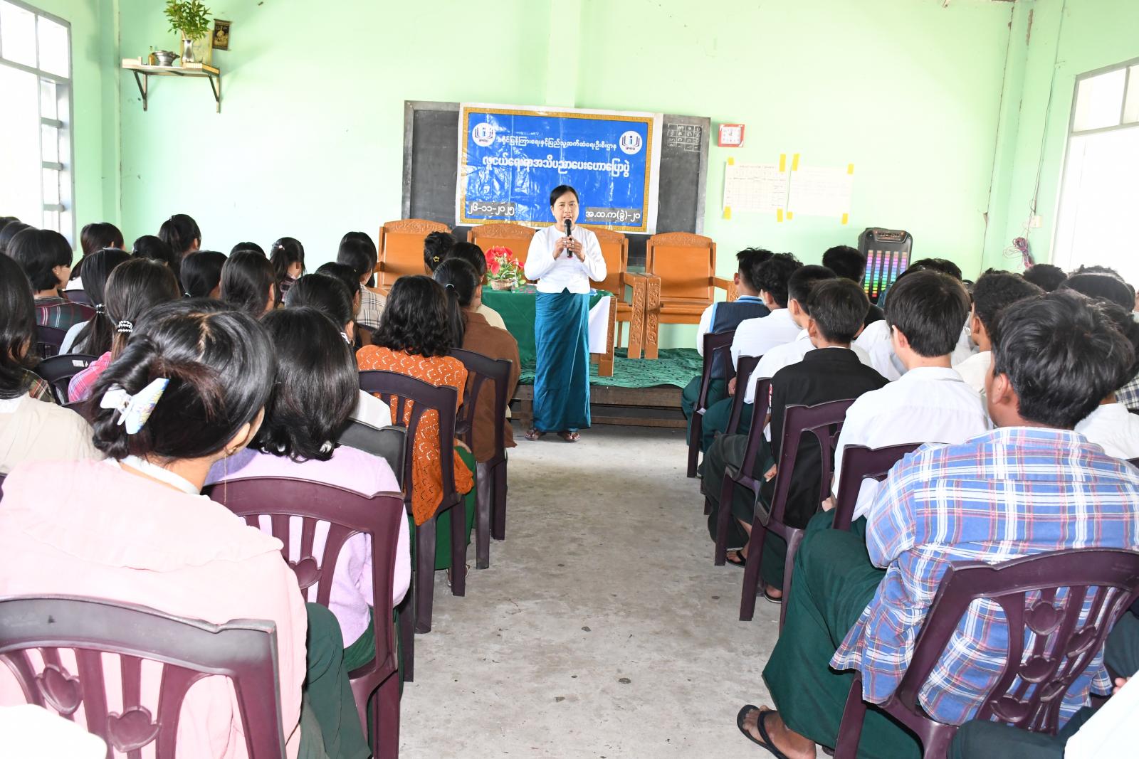 မန္တလေးတိုင်းဒေသကြီး၊ မဟာအောင်မြေခရိုင်၊ ပြည်ကြီးတံခွန်မြို့နယ်ရှိ အမှတ်(၂၀)အခြေခံပညာအထက်တန်းကျောင်းခွဲခန်းမ၌ ယနေ့နံနက် ၁၀ နာရီက လူငယ်ရေးရာ အသိပညာပေး ဟောပြောပွဲကျင်းပခဲ့သည်။