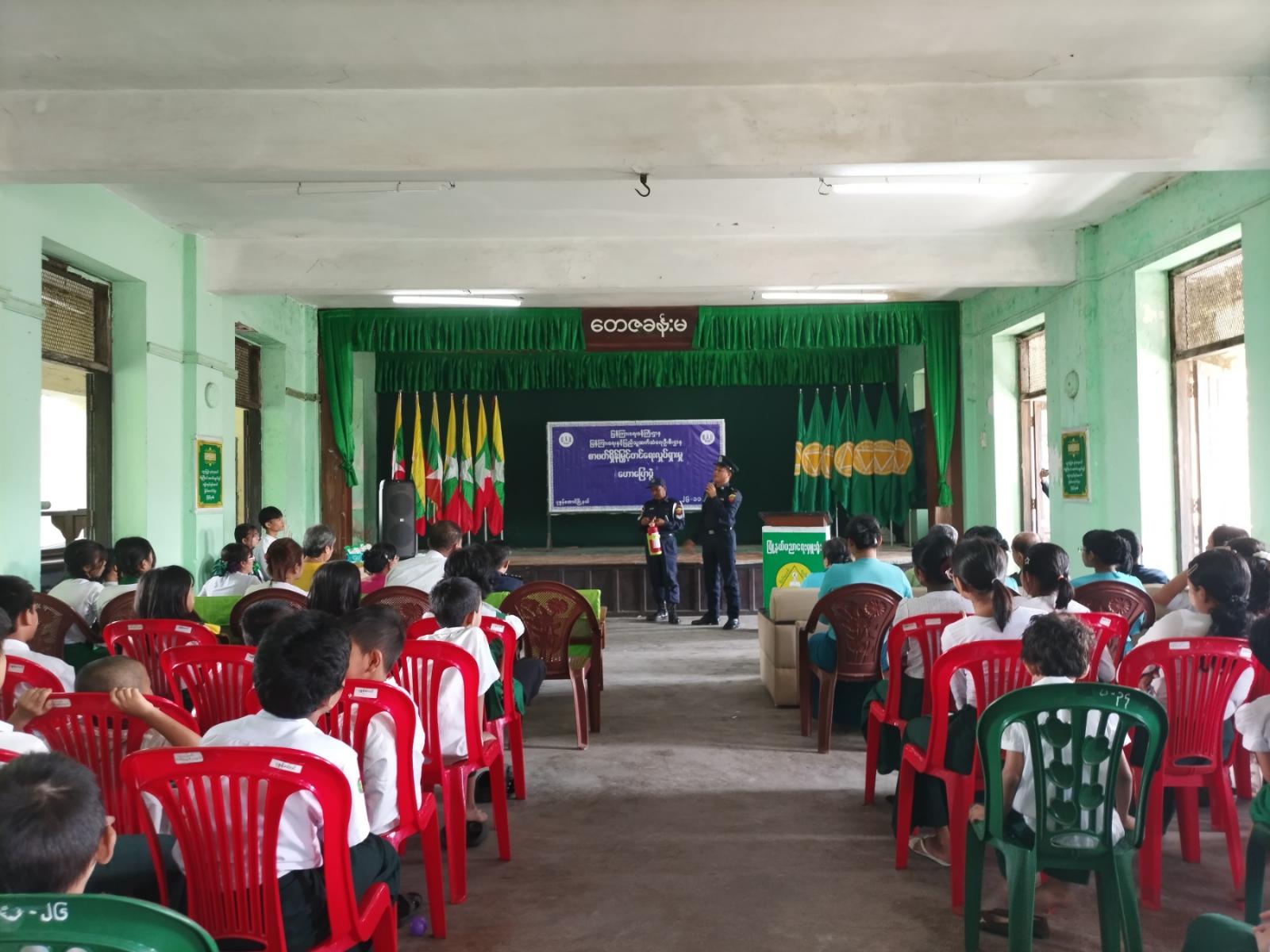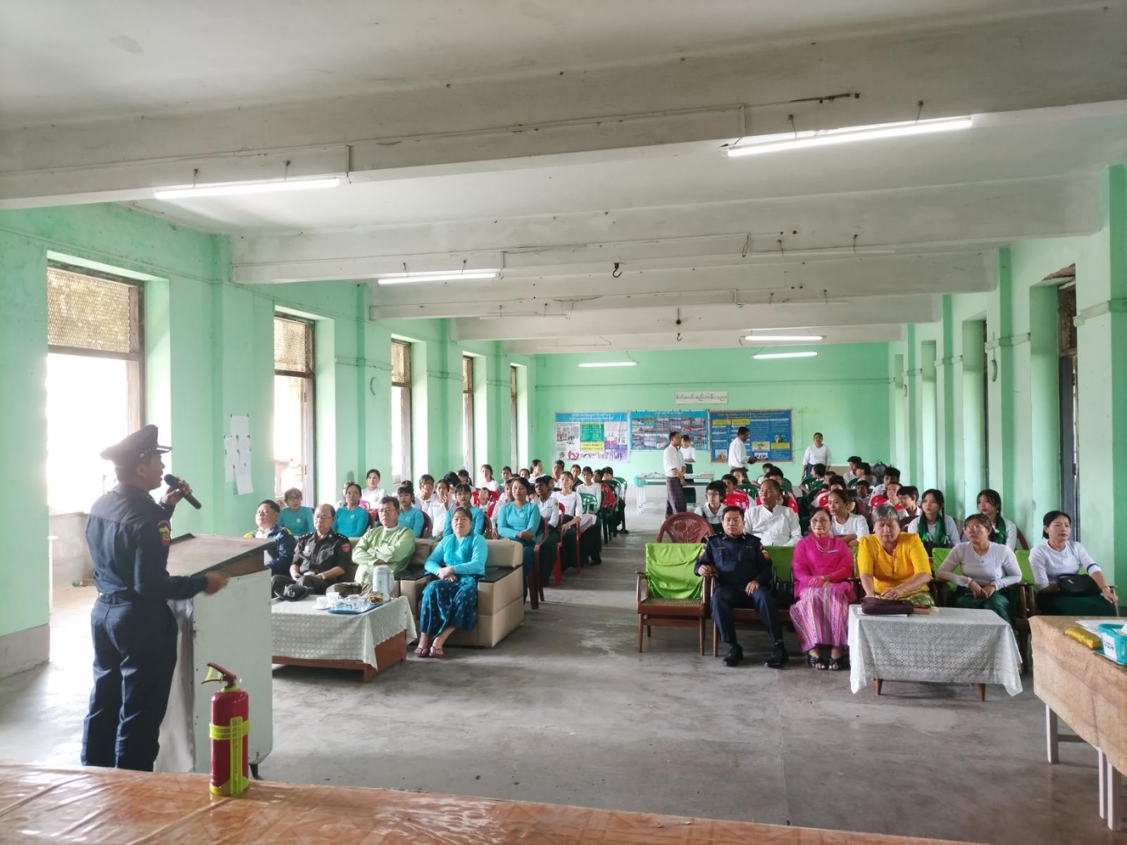 ရှေးဦးစွာ မြို့နယ်မီးသတ်ဦးစီးဌာနမှ ဒုတိယမြို့နယ်မီးသတ်ဦးစီးမှူး ဦးမျိုးဝင်းသူက ကျောင်းသူ/ ကျောင်းသားများ မီးဘေးအသိပညာများနားလည်သိရှိနိုင်ရေးအတွက် ဟောပြောပွဲကျင်းပဆောင်ရွက်ရခြင်းဖြစ်ကြောင်း၊ မီးဘေးအန္တရာယ်ကင်းဝေးရေးသည် အရေးပါသည့်ကိစ္စရပ်ဖြစ်သည့်အတွက် မီးဘေးကြိုတင်ကာကွယ်ရေးလုပ်ငန်းစဉ်များအား သိရှိနားလည်ရန်လိုအပ်ကြောင်း၊ မီးဘေးလုံခြုံရေးအတွက် လိုက်နာဆောင်ရွက်ရမည့် အကြောင်းအရာများ၊ ရှောင်ရှားရမည့်အချက်များ၊ မီးဘေးအန္တရာယ် ကြိုတင်ကာကွယ်ရမည့်လုပ်ငန်းစဉ်များအား အသိပညာပေးဟောပြောခဲ့သည်၊၊