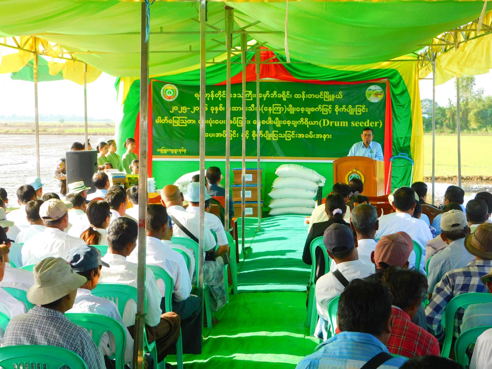 အခမ်းအနားတွင် ရန်ကုန်တိုင်းဒေသကြီး၊ စိုက်ပျိုးရေးဦးစီးဌာန တိုင်းဒေသကြီးဦးစီးမှူး ဦးတင့်နိုင်က အမှာစကားပြောကြားခဲ့ပြီး တိုင်းဒေသကြီးဦးစီးမှူး ဦးတင့်နိုင်၊ ရန်ကုန်တိုင်းဒေသကြီး မွေးမြူရေးနှင့်ကုသရေးဦးစီးဌာန တိုင်းဒေသကြီးဦးစီးမှူး ဒေါက်တာအောင်မြင့်ဟန်၊ မှော်ဘီခရိုင်စီမံခန့်ခွဲရေးနှင့်အုပ်ချုပ်ရေးကော်မတီအဖွဲ့ဝင် ဒုတိယဗိုလ်မှူးကြီး ဝေမိုးအောင်၊ ခရိုင်အဆင့်ဌာနဆိုင်ရာတာဝန်ရှိသူနှင့် မြို့နယ်တာဝန်ရှိသူများက ဒေသခံတောင်သူများထံသို့ နွေစပါးမျိုးစေ့ချကိရိယာ(Drum Seeder)၊ ဓါတ်မြေသြဇာနှင့် ပျားပုံးများကို ပေးအပ်ခဲ့ကြသည်။