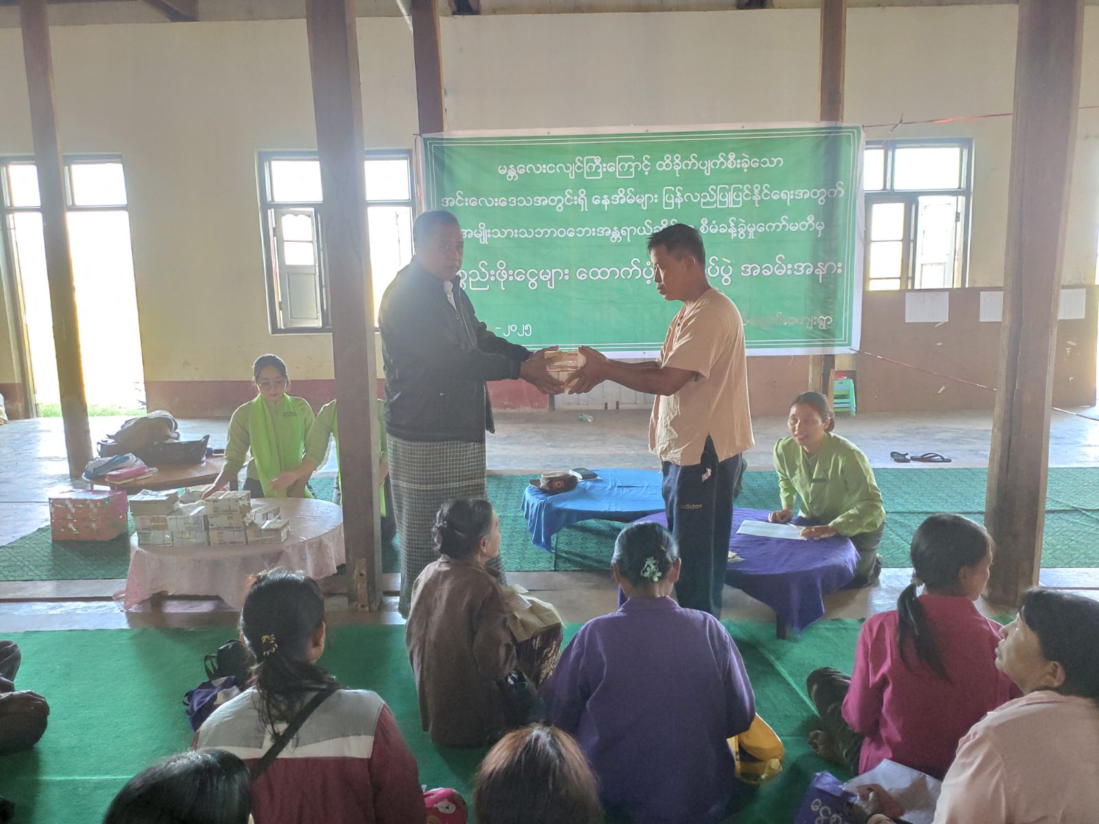 အခမ်းအနားတွင် မြို့နယ်ပညာရေးမှူး ဦးဇော်ဝင်း၊ မြို့နယ်ပြန်ကြားရေးနှင့်ပြည်သူ့ဆက်ဆံရေးဦးစီးဌာန ဦးစီးအရာရှိ ဦးနေမျိုးသူရိန်နှင့် မြို့နယ်အထွေထွေအုပ်ချုပ်ရေးဦးစီးဌာန ဒုတိယဦးစီးမှူး ဦးဇော်ဇော်သိုက်တို့က ပစ္စည်းဖိုးငွေများ ထောက်ပံ့ပေးအပ်ခြင်းနှင့်စပ်လျဉ်း၍ အမှာစကားပြောကြားကြပြီး တာဝန်ရှိသူများက ထောက်ပံ့ပေးအပ်ငွေများကို မန္တလေးငလျင်ဒဏ်ကြောင့် ထိခိုက်ပျက်စီးခဲ့သည့် ဒေသခံနေအိမ်ပိုင်ရှင်သို့ တစ်ဦးချင်းစီ ထုတ်ပေးခဲ့ကြောင်း သိရသည်။