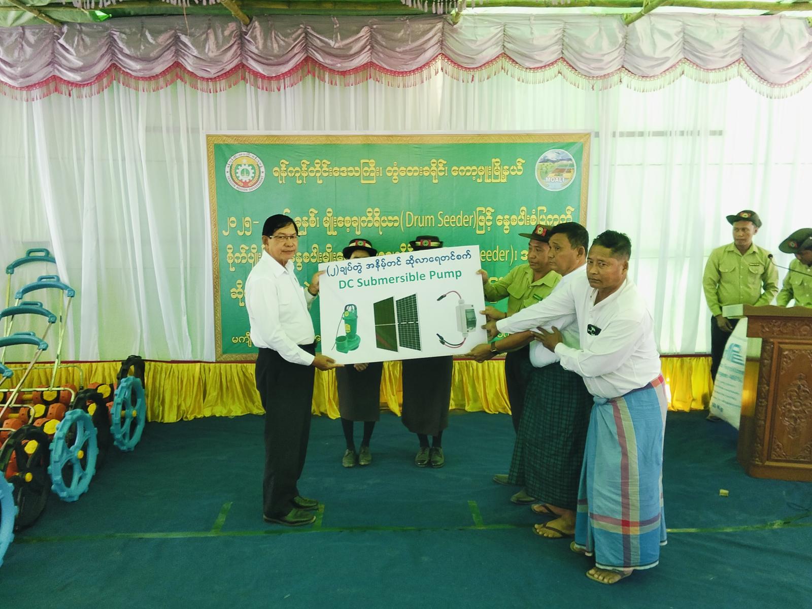 ထို့နောက် ရန်ကုန်တိုင်းဒေသကြီးအစိုးရအဖွဲ့ ဝန်ကြီးချုပ် ဦးစိုးသိန်းက လမ်းညွှန်အမှာစကားပြောကြားခဲ့ပြီး ဝန်ကြီးချုပ် ဦးစိုးသိန်း၊ တိုင်းဒေသကြီးအစိုးရအဖွဲ့ဝင်ဝန်ကြီးများက နွေစပါးမျိုးစေ့၊ မျိုးစေ့ချကိရိယာ Drum Seeder ၊အနိမ့်တင်ဆိုလာ (၂) ချပ်တွဲရေတင်စက်နှင့် ဓာတ်မြေဩဇာများအား တာဝန်ရှိသူများနှင့် တောင်သူများထံ ပေးအပ်ခဲ့ကြကြောင်း သိရသည်။