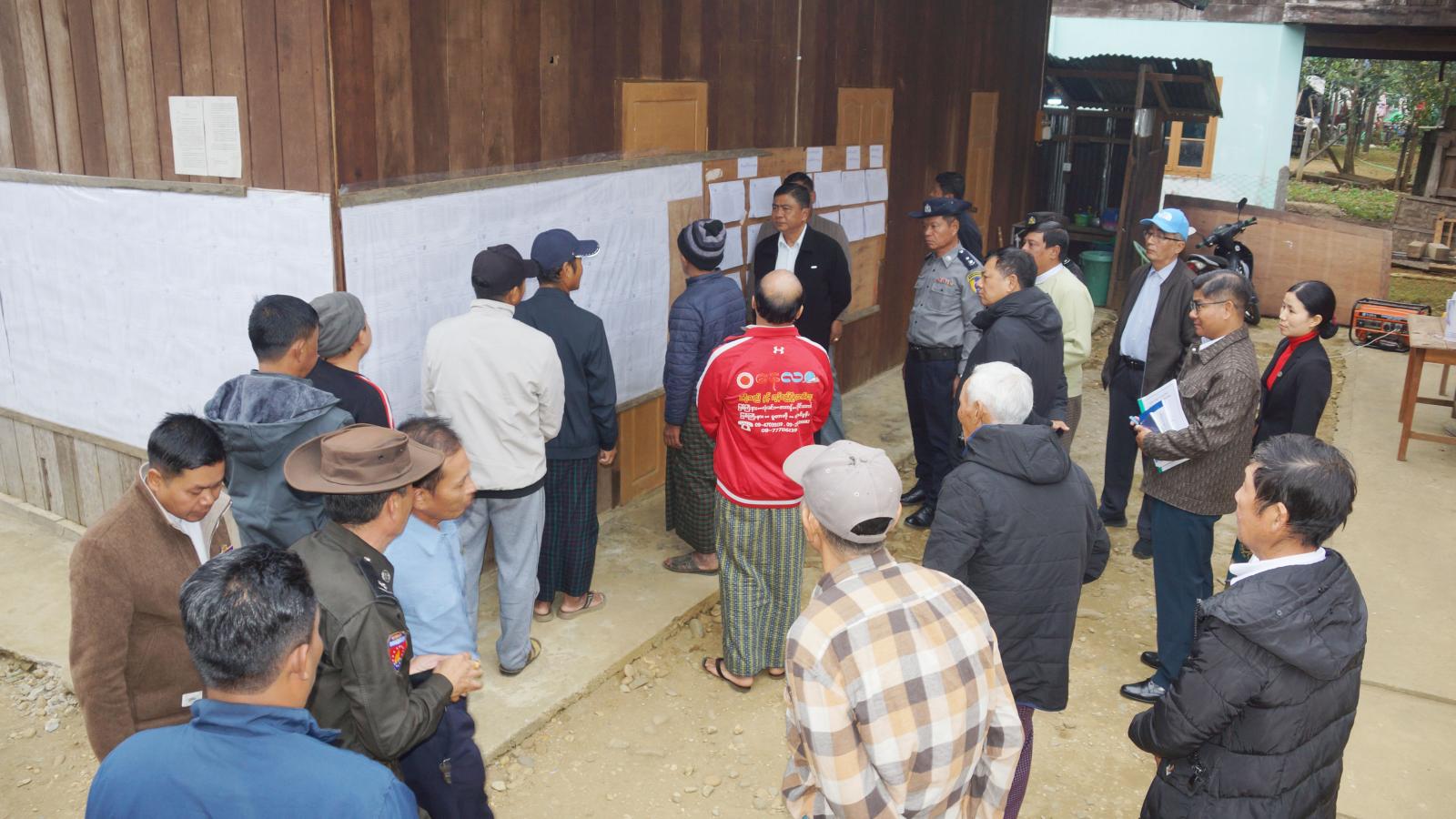 ဆက်လက်၍ ပြည်ထောင်စုရွေးကောက်ပွဲကော်မရှင်အဖွဲ့ဝင် ဦးခင်ဇော်နှင့်တာဝန်ရှိသူများသည် ပူတာအိုမြို့ လေယာဉ်ကွင်းရပ်ကွက်အုပ်ချုပ်ရေးမှူးရုံး၌ တတိယအကြိမ် အတည်ပြုပြီး မဲစာရင်းများကပ်ထားကြေညာမှုများအား ပြည်သူများလာရောက်ကြည့်ရှုမှုများကို ကြည့်ရှုစစ်ဆေးသည်။