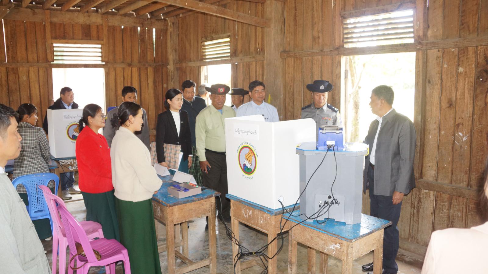 ပြည်ထောင်စုရွေးကောက်ပွဲကော်မရှင်အဖွဲ့ဝင် ကချင်ပြည်နယ်တာဝန်ခံ ဦးခင်ဇော်သည် ပြည်နယ်ရွေးကောက်ပွဲကော်မရှင်အဖွဲ့ဝင် ဦးဒိန်ရထင်ဗေး၊ ဦးသိန်းစိုးနှင့် ပြည်နယ်ရွေးကောက်ပွဲအရာရှိ ဦးမျိုးမင်းဦး၊ ခရိုင်စီမံခန့်ခွဲရေးနှင့်အုပ်ချုပ်ရေးကော်မတီဥက္ကဋ္ဌ ဦးစိုးထွန်းတို့နှင့်အတူ ဒီဇင်ဘာ(၂၅)ရက် နံနက်ပိုင်းက ပူတာအိုခရိုင်အတွင်းရှိ ပူတာအို၊ မချမ်းဘောမြို့နယ်များတွင် မဲရုံခင်းကျင်းပြင်ဆင်ဆောင်ရွက်ထားရှိမှုများနှင့် တတိယအကြိမ် အတည်ပြုပြီး မဲစာရင်းများ ကပ်ထားကြောငြာထားရှိမှုများအား ကွင်းဆင်းစစ်ဆေးသည်။