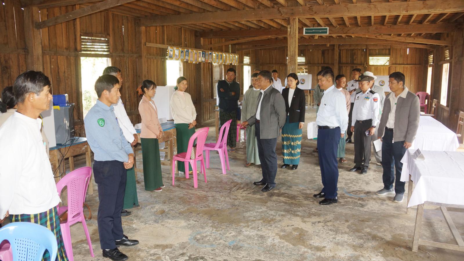 ရှေးဦးစွာ ပြည်ထောင်စုရွေးကောက်ပွဲကော်မရှင် အဖွဲ့ဝင် ဦးခင်ဇော်သည် ပူတာအိုမြို့နယ် ဆာရ်ခွမ်ဒမ်းကျေးရွာအုပ်စု ထဝါဒမ်းကျေးရွာအခြေခံပညာအထက်တန်းကျောင်းခွဲ မဲရုံအမှတ်(၂)၌ ၂၀၂၅-ခုနှစ် ဒီဇင်ဘာ(၂၈)ရက်နေ့တွင် ကျင်းပပြုလုပ်မည့် ပါတီစုံဒီမိုကရေစီ အထွေထွေရွေးကောက်ပွဲ အပိုင်း(၁)အတွက် မဲရုံအတွင်း လွတ်တော်အလိုက် ခင်းကျင်းပြင်ဆင်ဆောင်ရွက်ထားရှိမှုများနှင့် ရွေးကောက်ပွဲ အပိုင်း(၂)၊ ၂၀၂၆-ခုနှစ် ဇန်နဝါရီ(၁၁)ရက်နေ့တွင် ကျင်းပပြုလုပ်မည့် မချမ်းဘောမြို့နယ် ထရန်ဒမ်းကျေးရွာ အခြေခံပညာအထက်တန်းကျောင်း မဲရုံအမှတ်(၂)တွင် မဲရုံအတွင်း လွတ်တော်အလိုက် ခင်းကျင်းပြင်ဆင်ဆောင်ရွက်ထားရှိမှုများအား ကြည့်ရှုစစ်ဆေးပြီး ပြည်ထောင်စုရွေးကောက်ပွဲကော်မရှင် အဖွဲ့ဝင်က မဲရုံတာဝန်ကျမဲရုံမှူးနှင့် အဖွဲ့ဝင်များအား ရင်းရင်းနှီးနှီးတွေ့ဆုံကာ အပိုင်းလိုက်ကျင်းပပြုလုပ်သွားမည့် ရွေးကောက်ပွဲ အောင်မြင်စွာ ကျင်းပနိုင်ရေးအတွက် ကျရာအခန်းကဏ္ဍမှ ဝိုင်းဝန်းပူးပေါင်းဆောင်ရွက်ကြရေးမှာကြားသည်။