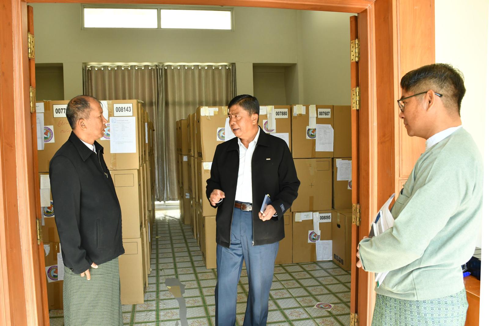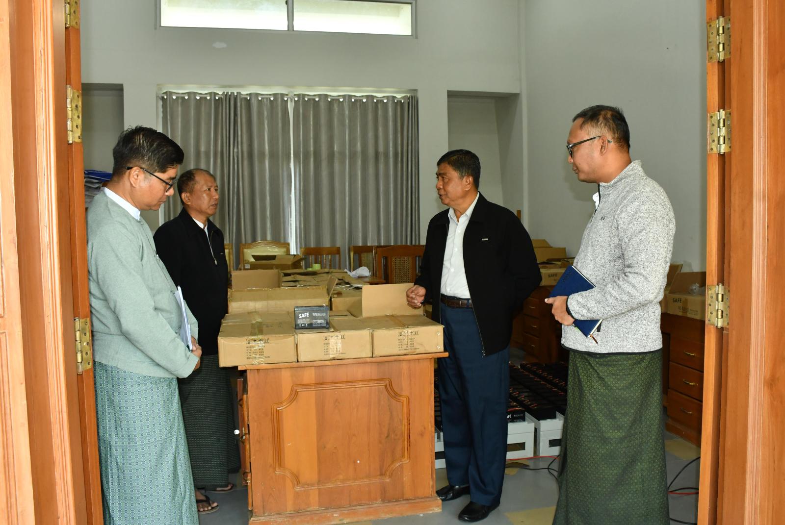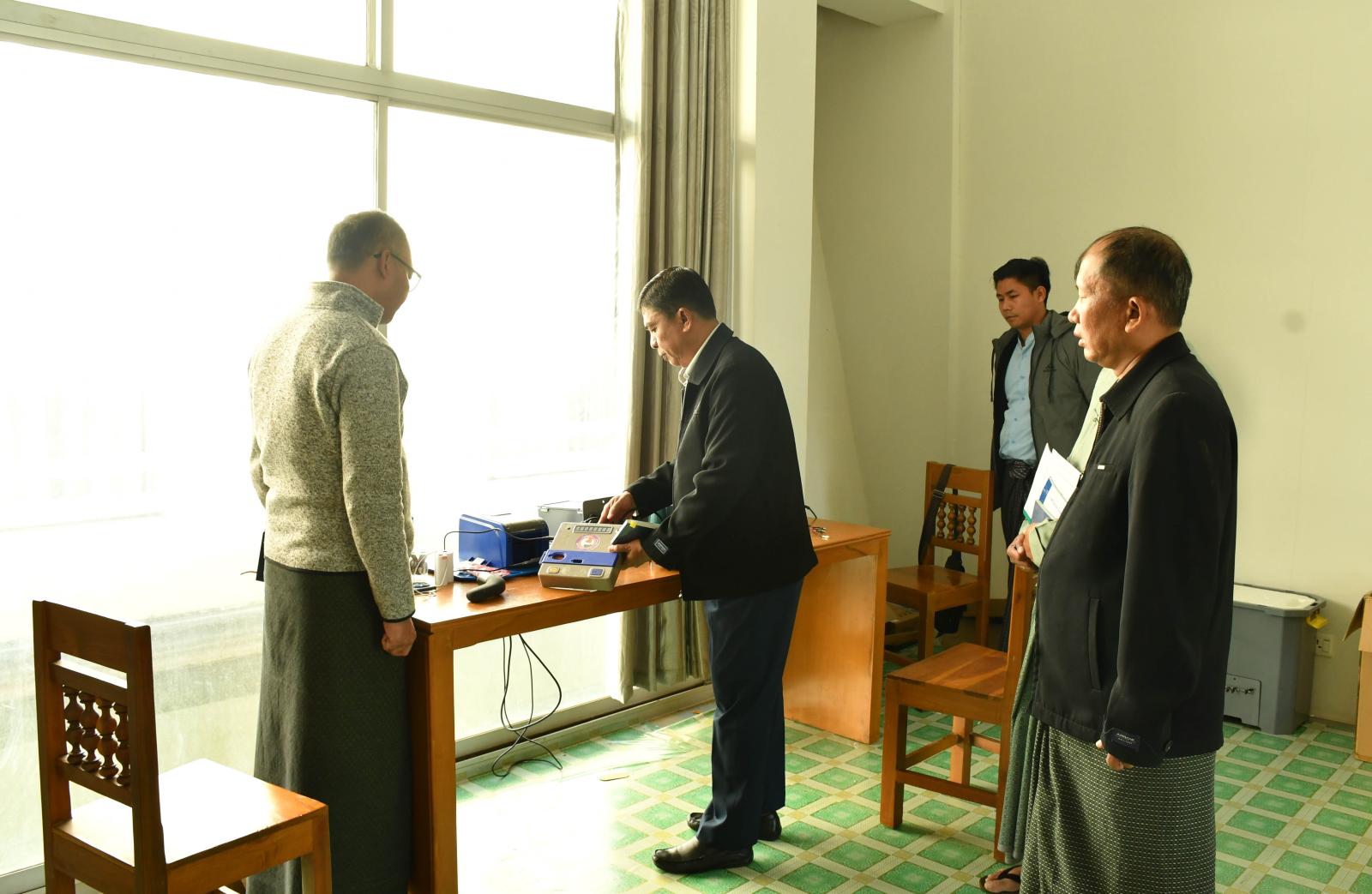 ရှေးဦးစွာ ပြည်နယ်တာဝန်ခံနှင့် တာဝန်ရှိသူများသည် ပြည်နယ်လွှတ်တော်ရုံး၌ မြန်မာအီလက်ထရောနစ်မဲပေးစက်များနှင့် ဆက်စပ်ပစ္စည်းများကို တာဝန်ရှိသူများက စနစ်တကျစစ်ဆေး၍ ပြန်လည်အပ်နှံထားရှိမှု အခြေအနေများနှင့် မဲပေးစက်တွင် အသုံးပြုခဲ့သည့် (၁၂)ဗို့ ဘက်ထရီအိုးများကို ပြန်လည်အားသွင်း၍ စစ်ဆေးဆောင်ရွက်နေမှု အခြေအနေများကို လှည့်လည် ကြည့်ရှုစစ်ဆေးခဲ့ကာ လိုအပ်သည်များကို တာဝန်ရှိသူများနှင့် ပေါင်းစပ်ညှိနှိုင်းဆောင်ရွက်ပေးခဲ့သည်။