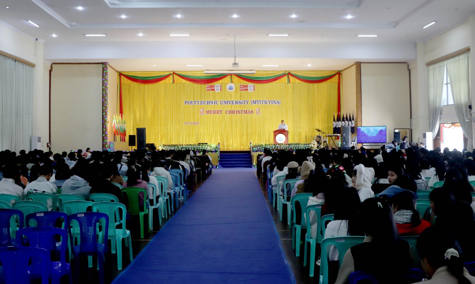 Polythenic University (Myitkyina) ၂၀၂၅ ခုနှစ်၊ ခရစ္စမတ်ပွဲတော်နှင့် ဝတ်ပြုဆုတောင်းပွဲ အခမ်းအနားကို ဒီဇင်ဘာ ၃၀ ရက် နံနက် ၁၀ နာရီက တက္ကသိုလ်ဘွဲ့နှင်းသဘင်ခန်းမ၌ ကျင်းပပြုလုပ်ရာ ကချင်ပြည်နယ်အစိုးရအဖွဲ့ဝင် သယံဇာတရေးရာဝန်ကြီး ဦးတိန့်ဆောင် တက်ရောက်ခဲ့သည်။
