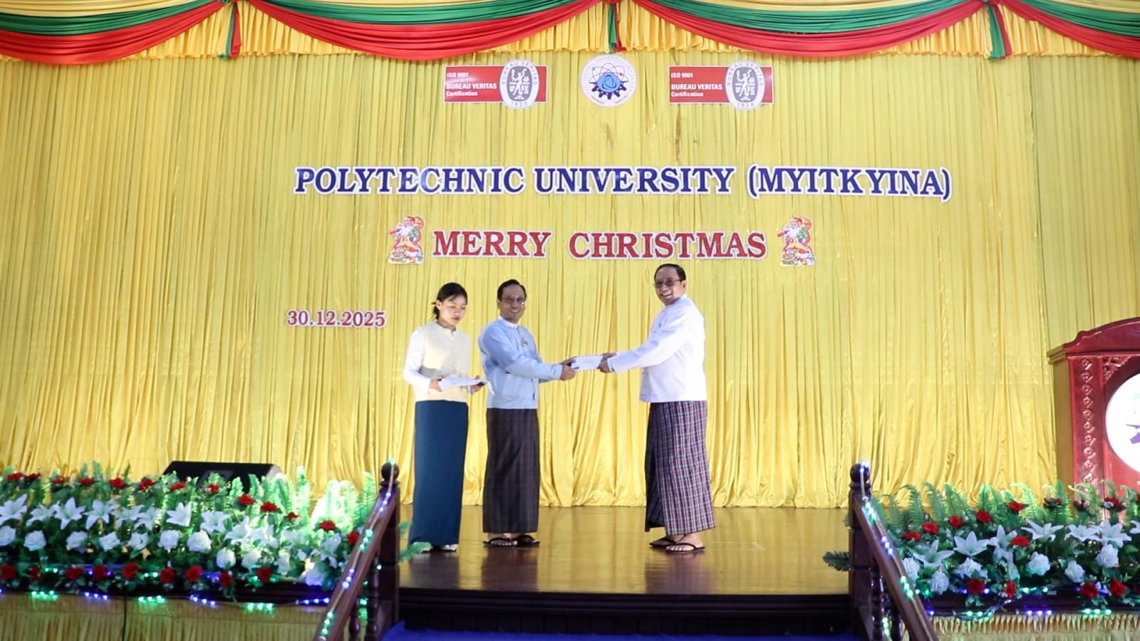 ရှေးဦးစွာ ခရစ်တော်မွေးနေ့အထိမ်းအမှတ် ဝတ်ပြုဆုတောင်းပွဲကို အစပြု ဆုတောင်းဆက်ကပ်ခဲ့ကြပြီး ဓမ္မတေးသီချင်းအားသီဆိုကျူးဧခဲ့ကြကာ ပြည်နယ်ဝန်ကြီးက ခရစ်တော်မွေးနေ့ မြတ်အချိန်အခါကာလတွင် ယခုလို Polytechnic University (Myitkyina) ဒုတိယပါမောက္ခချုပ်၊ ဌာနမှူးများ၊ တာဝန်ရှိသူများ၊ ကျောင်းသား/ ကျောင်းသူများနှင့်အတူ အတူတကွ ကျေးဇူးတော်ချီးမွမ်းခွင့်၊ ဆုတောင်းဆက်ကပ်အပ်နှံခွင့် ရရှိသည့်အတွက် ဝမ်းမြောက်ဝမ်းသာဂုဏ်ယူပါကြောင်း ကြိုဆိုနှုတ်ခွန်းဆက်စကားပြောကြားသည်။ ယင်းနောက် Polytechnic University (Myitkyina) ဒုတိယပါမောက္ခချုပ် ဒေါက်တာမင်းမင်းဦးက အစီအစဉ် အစ၊ အလယ်၊ အဆုံး ပါဝင်ဆက်ကပ်သူများ အားလုံးအတွက် ကျေးဇူးတင်စကား ပြန်လည်ပြောကြားခဲ့ကာ ပြည်နယ်ဝန်ကြီးက တက္ကသိုလ် ခရစ္စမတ်ပွဲတော်အတွက် အလှူငွေကို ဒုတိယပါမောက္ခချုပ် ဒေါက်တာမင်းမင်းဦးထံ ပေးအပ်ခဲ့သည်။